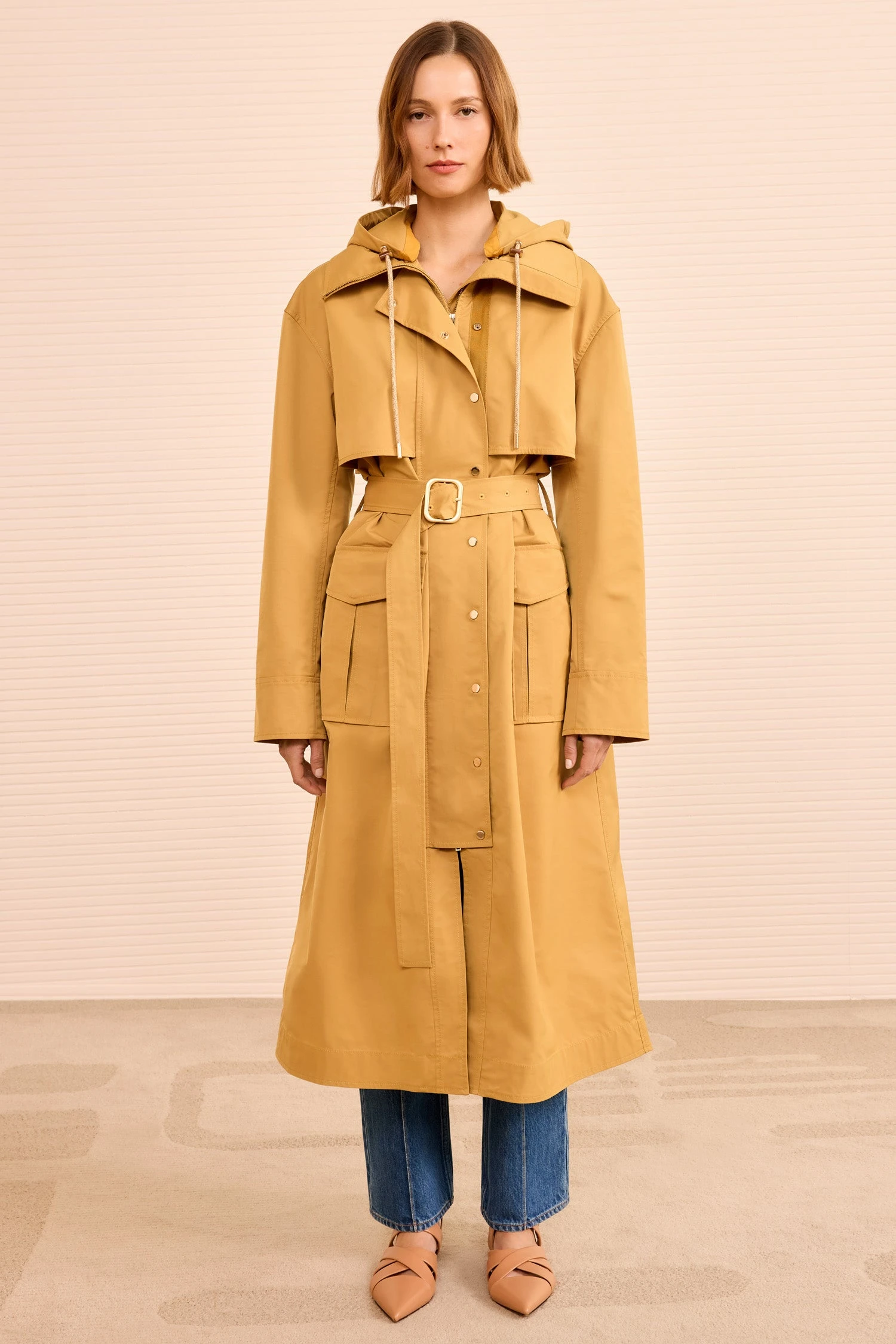 The Adara Coat fuses trench style elements with modern elegance. Tailored from lightweight nylon, it features a storm flap and a wide waist belt that brings dimension to the silhouette. The drawstring hood is removable, while the neutral yellow hue lends versatile ease.Â
