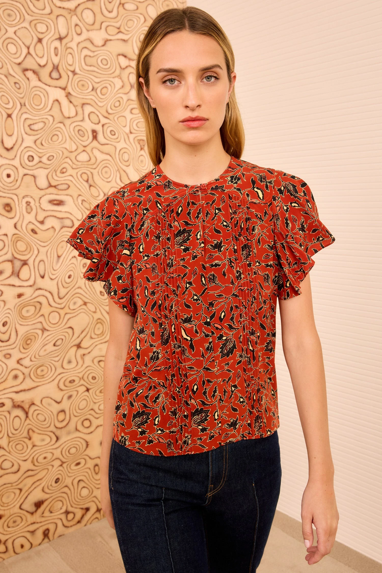 Patterned with a floral batik print, the Adoni Top is as visually graphic as it is effortless. The flutter sleeves lend soft movement, while the relaxed fit is ideal for styling with denim and tailoring,