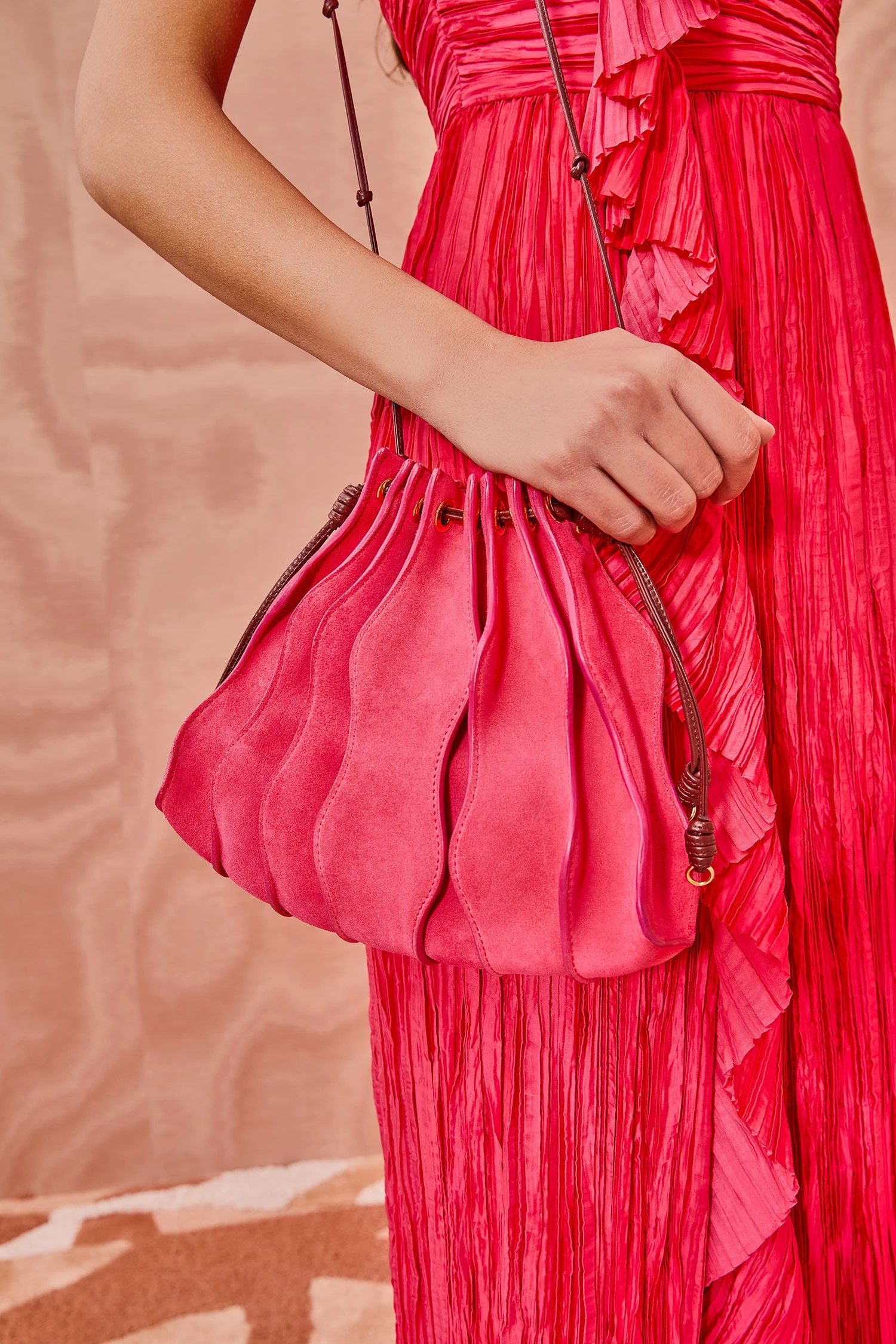 As featured in Look 5 of our Pre-Fall ’23 Lookbook, the Adria Small Pleated Wave Bag is a gorgeous new addition to our handbag collection, defined by undulating seams that adorn its sumptuous leather exterior in a pink colorblock. This crossbody bag features a drawstring opening and is finished with shiny brass detailing.