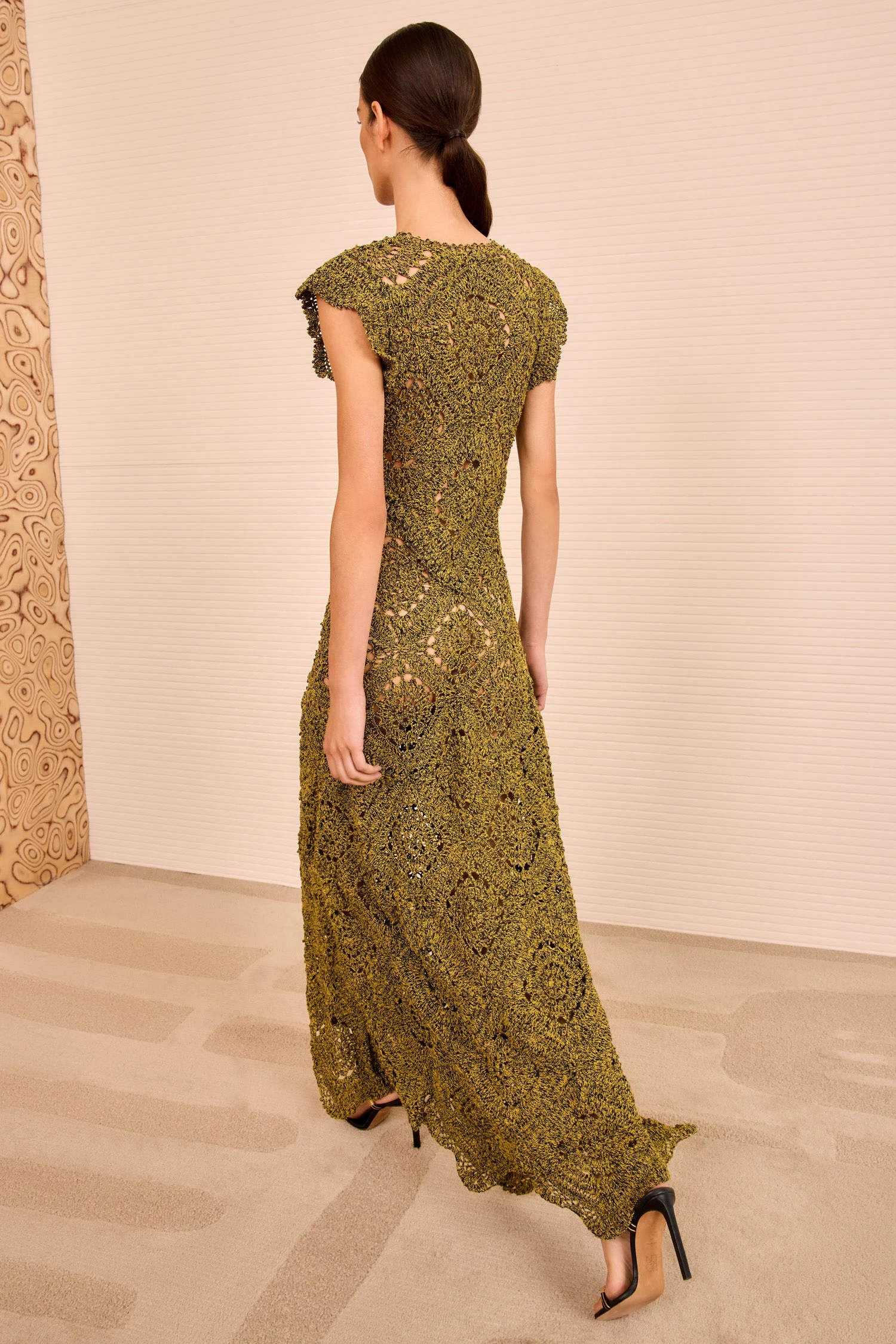 Part of the Ulla Johnson artisan heritage, the Annalisa Dress is hand-crocheted from cotton into a kaleidoscope of geometric motifs that gracefully reveal and conceal. This olive green dress skim the body and has gentle volume at the hem.