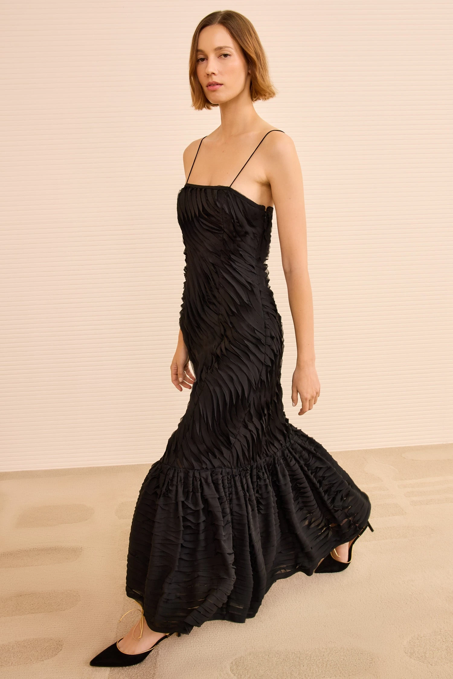 The Augustina Dress breathes with undulating motion created by strips of raw, bias-cut chiffon meticulously placed in wavy linear motifs. Arriving in perennial black, this occasion-ready dress is suspended from delicate straps and is fluted at the hem for graceful movement.