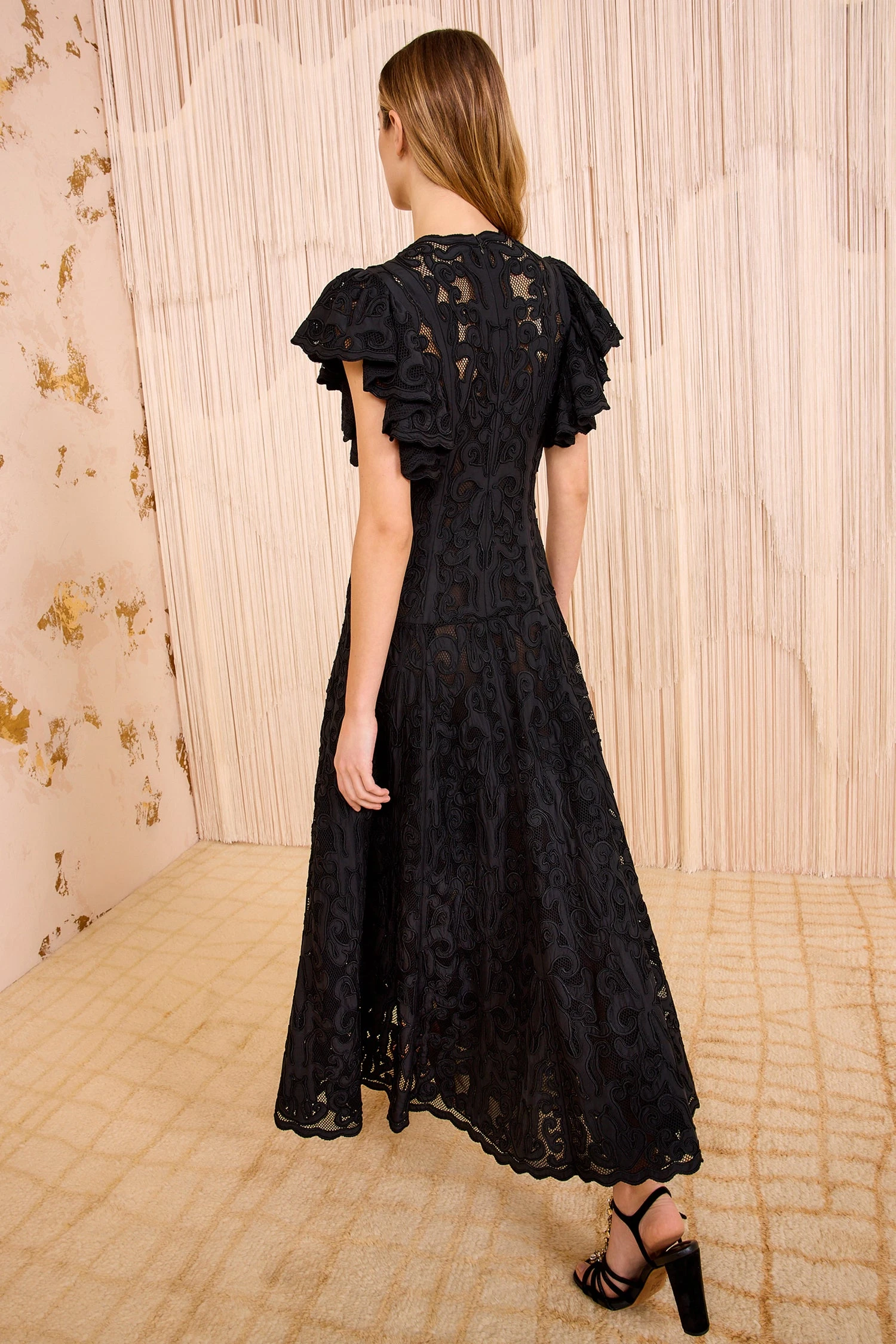 An impeccable display of craft, the Cecile Dress showcases a Victorian-inspired embroidered appliqué, set against a delicate mesh with intricate taffeta patchwork. Framed by fluttering sleeves, this black silhouette arrives with a removable slip for a look that reveals and conceals.