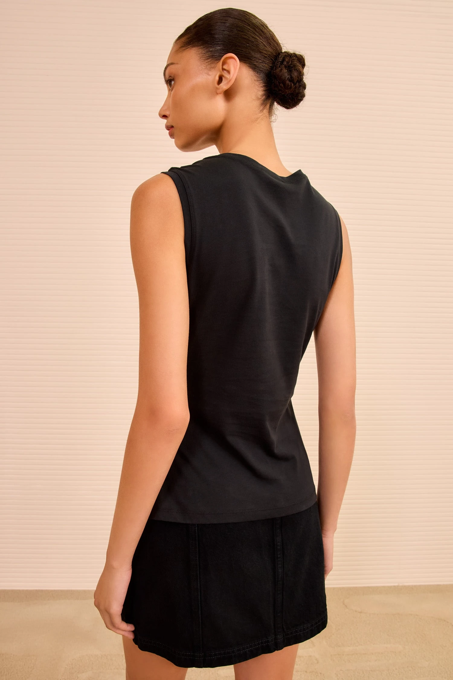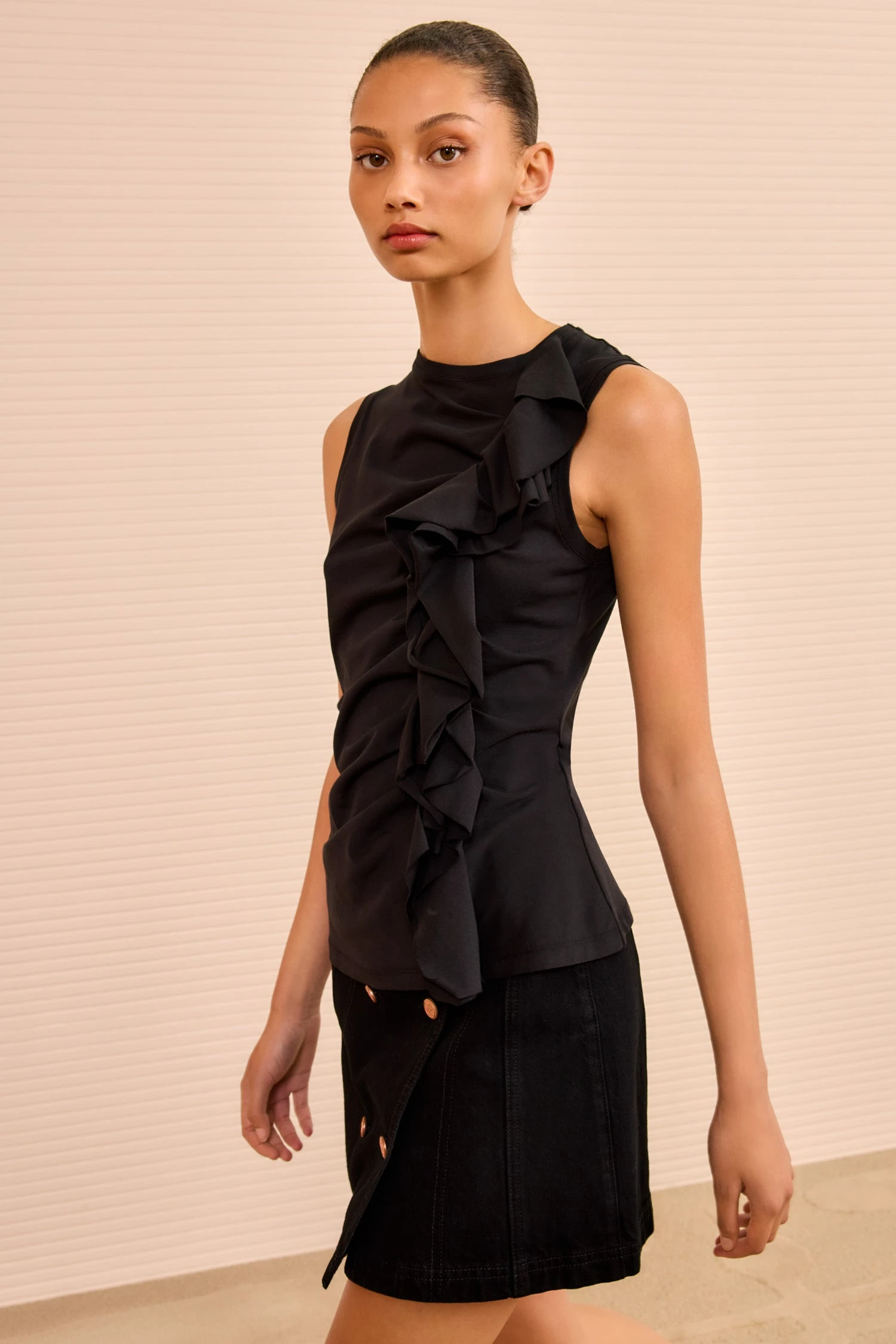 The Clio Top is elegantly draped from organic cotton jersey in perennial black. This effortless top comes alive with asymmetric ruching that releases into soft, cascading ruffles.Â