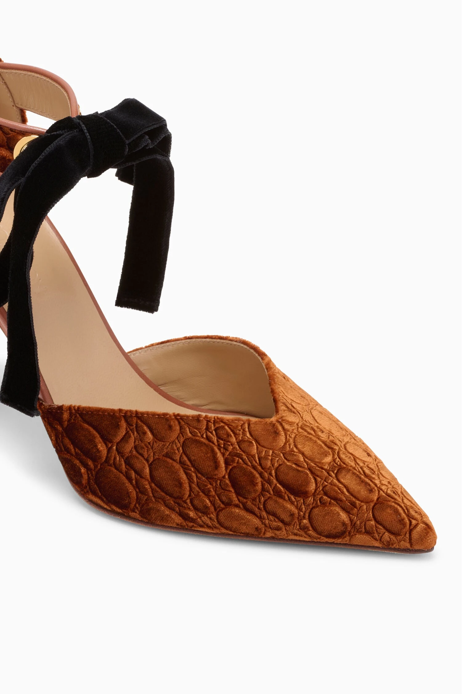Crafted in Italy, the Corinna Heel arrives in Sierra brown velvet richly adorned with exotic croc embossing. This point-toe style features a d’Orsay silhouette lined in leather and is defined by an elegant velvet bow closure with brass eyelets.Â
