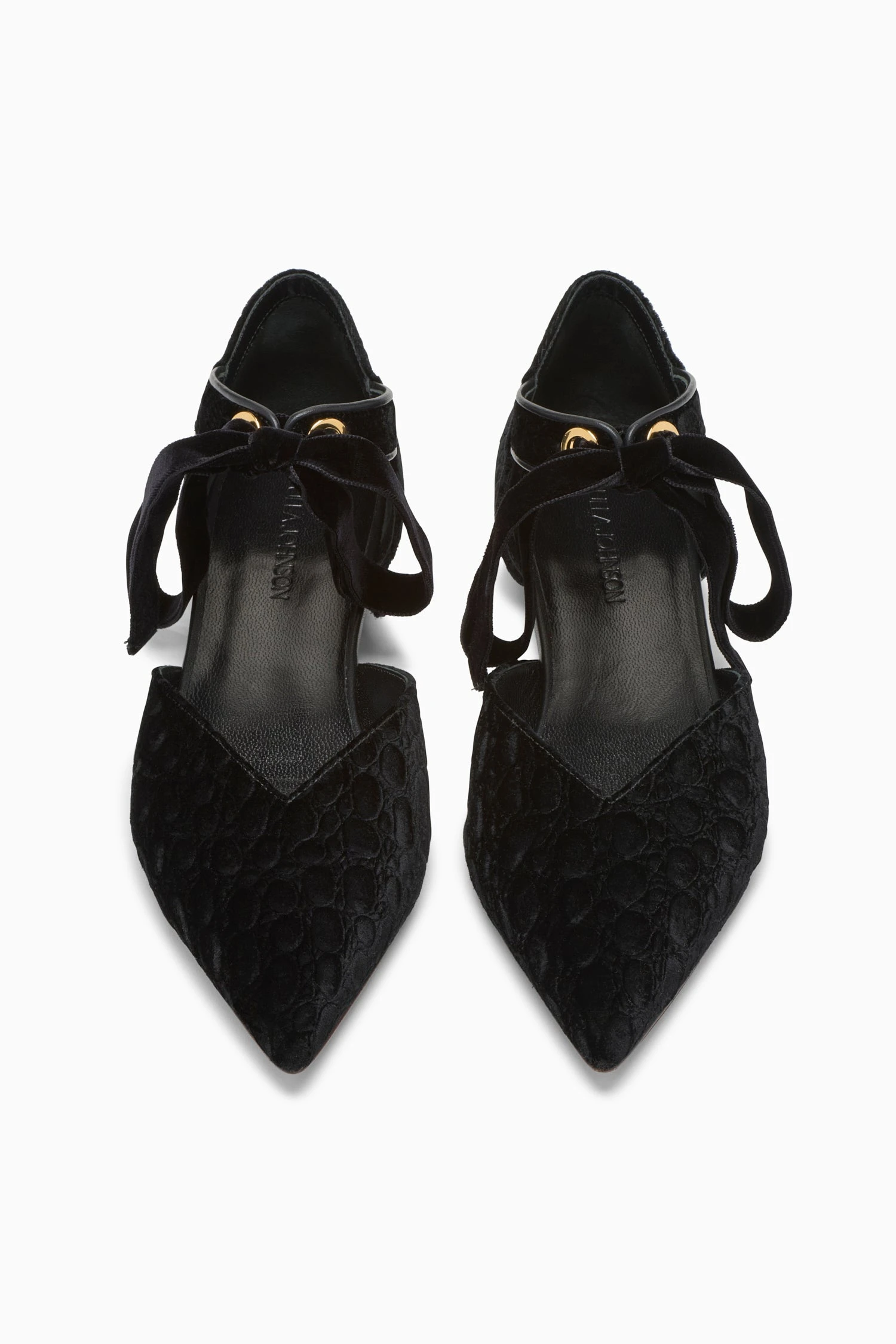 Distinctive yet effortless, the Corinna Flat is crafted in Italy from plush black velvet with exotic croc embossing. This point-toe style features a d’Orsay silhouette lined in leather and is defined by an elegant velvet bow closure with brass eyelets.Â