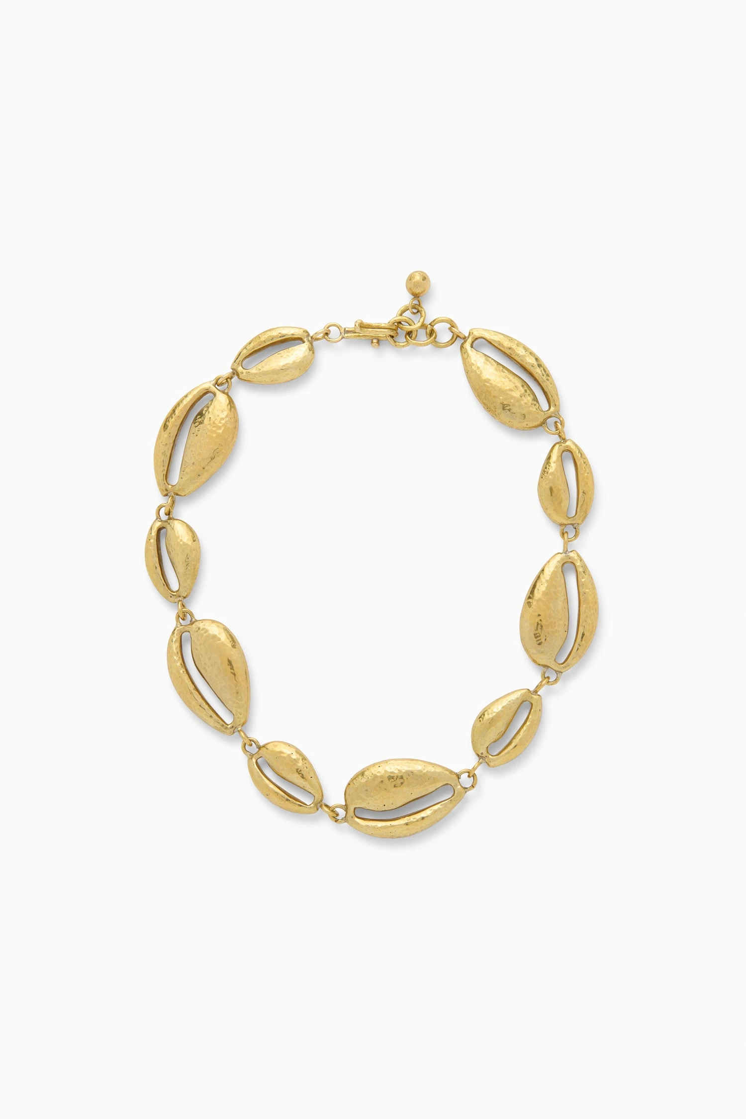 This bracelet takes inspiration from nature’s organic forms, crafted by our longtime artisan partners into gestural cowrie shells. It’s brought to life by a traditional sand-casting technique—molten brass is heated in a kiln, hand-poured into a mold made of sand, and then hand-shaped into this sculptural adornment.