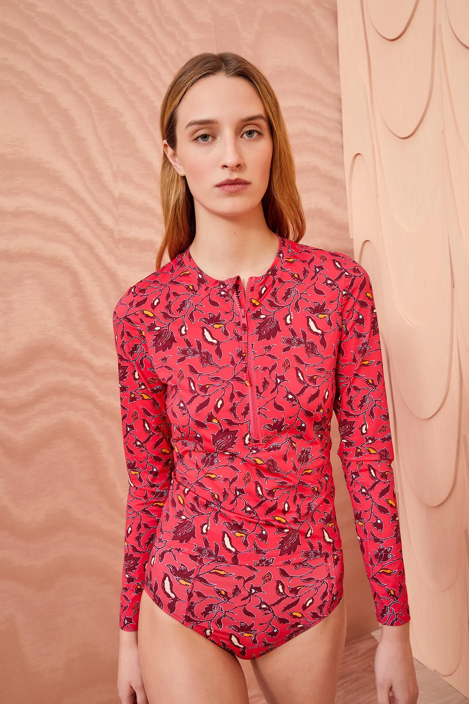 An Ulla Johnson exclusive only available in our stores or on our website, the Dione Rash Guard is crafted from comfortable, stretchy nylon that boasts a floral dark pink geometric print. This long-sleeved, full-coverage swim silhouette is a pull-over style and features a classic round collar. This showstopping gown is an Ulla Johnson exclusive and is only available in our stores or on our website.