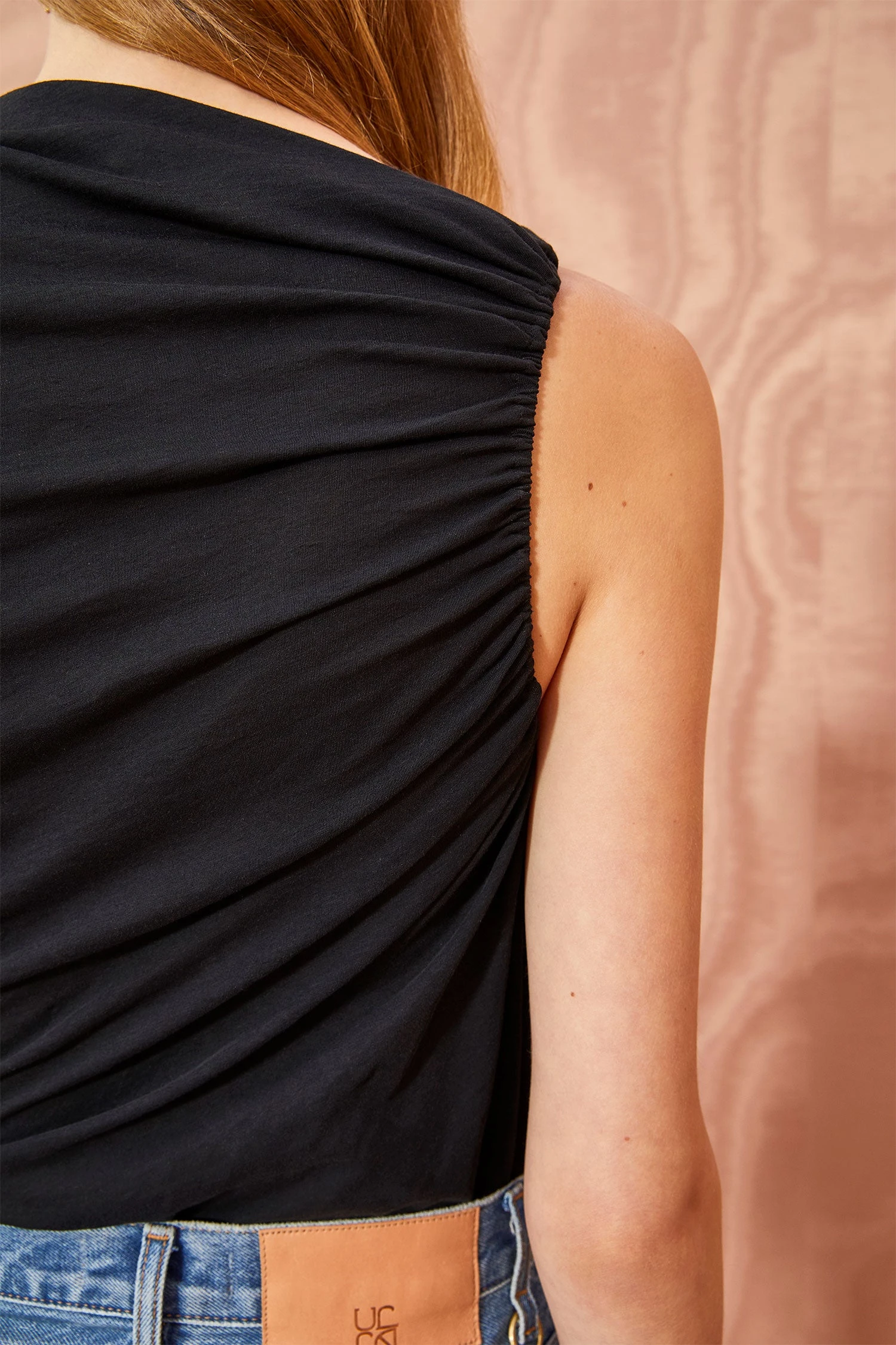 The Fia Top is crafted from our tissue-weight jersey in a classic black monochrome hue. This sleeveless silhouette features an asymmetrical neckline that creates striking gathers along the bodice.