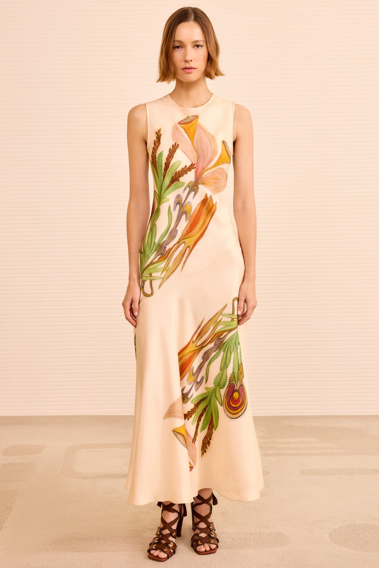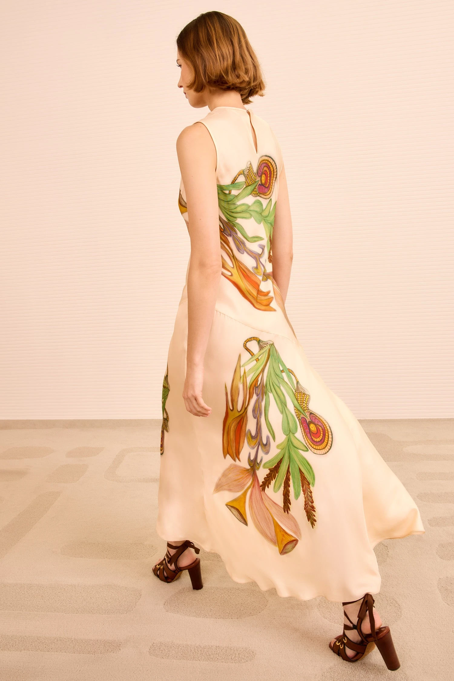 A signature Ulla Johnson silhouette, the Gaea Dress breathes with surreal, mystical florals from the gestural work of Art Brut painter Anna Zemánková. This multicolored dress is crafted from luxurious silk twill and is cut on the bias for an elegant, body-skimming fit that brings the botanicals to life.