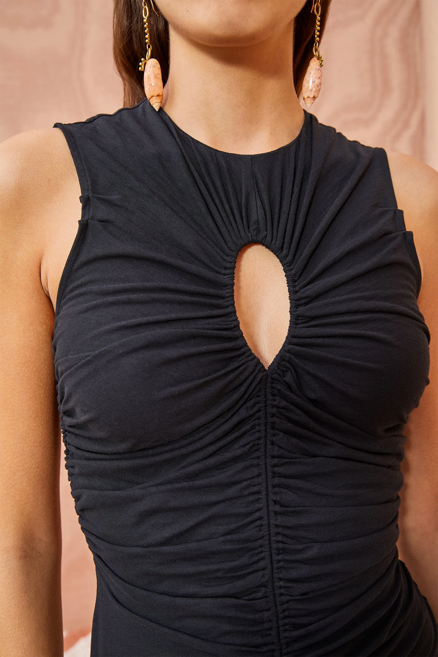 As featured in Look 28 of our Pre-Fall ’23 Lookbook, the Gwynne Dress is made from our signature tissue-weight jersey fabric, which has become a staple in all of our collections due to its stretchy and luxurious texture. Designed in a classic black monochrome hue, this dress is defined by ruching that creates a sexy keyhole at the center of the bust.