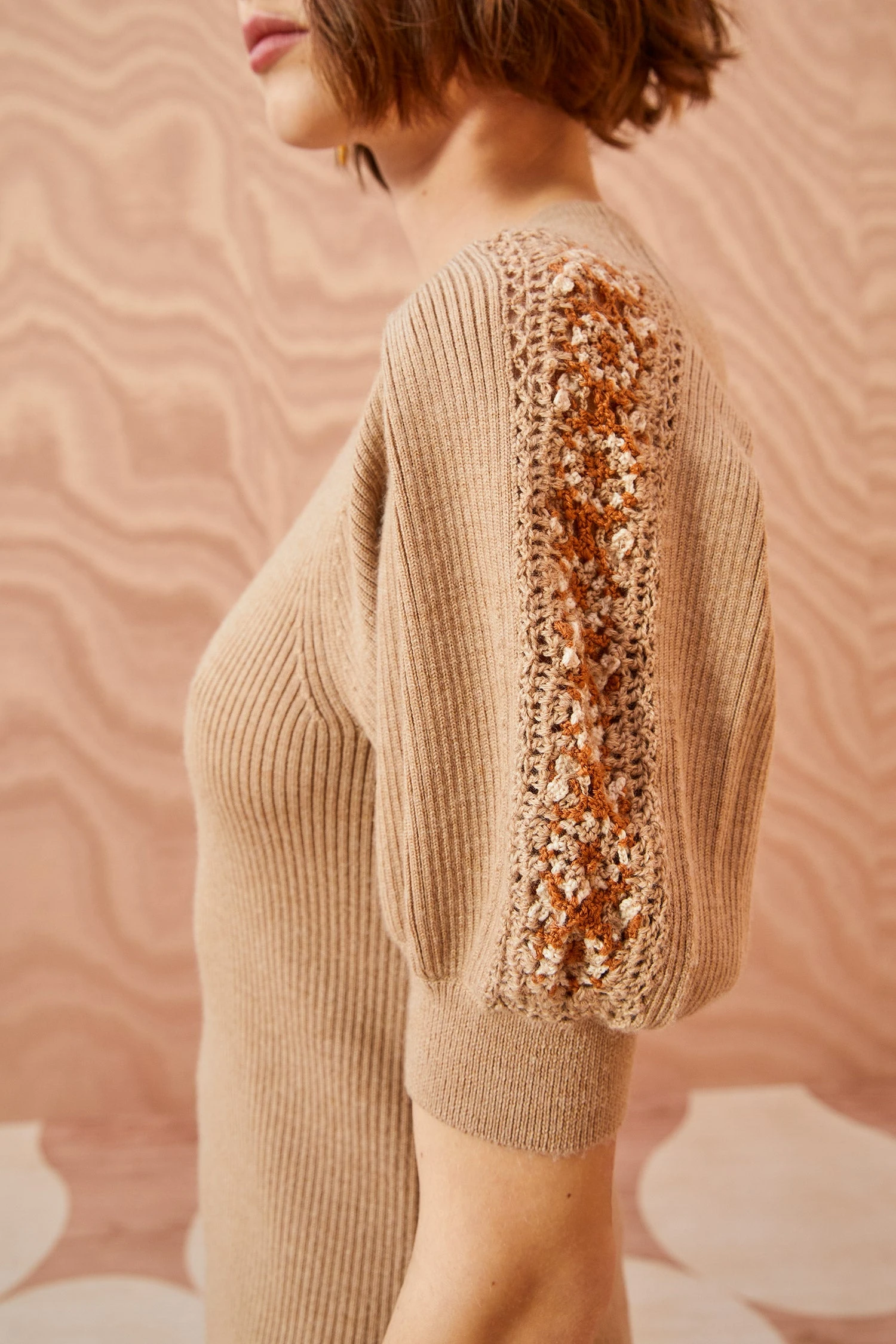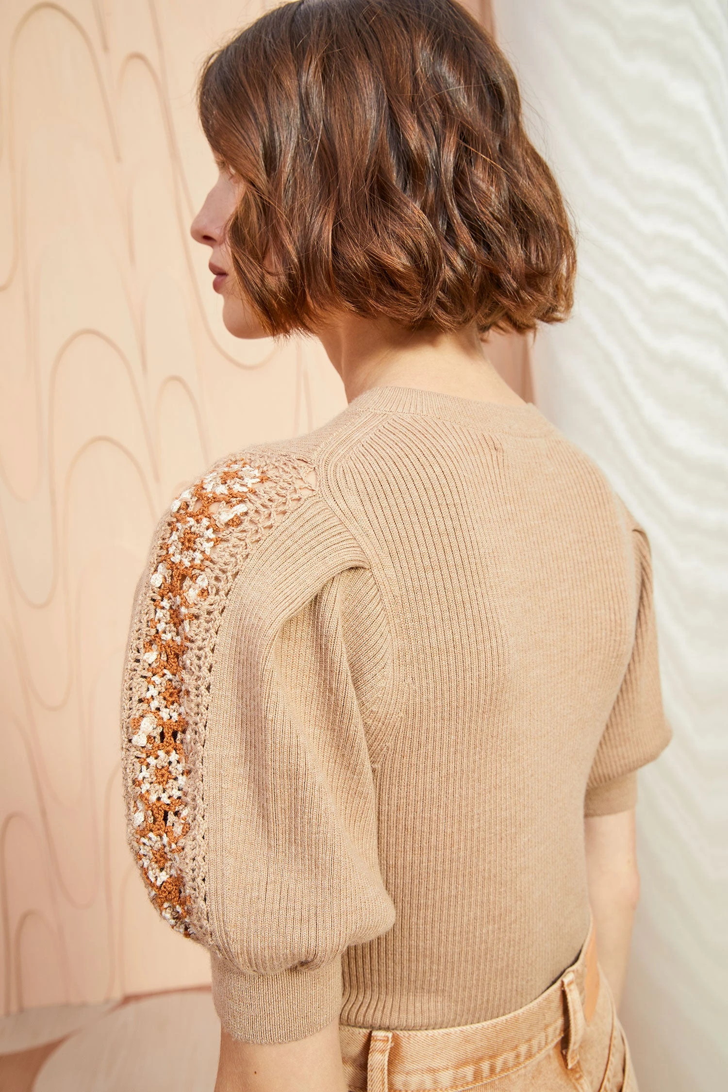 The Harper Top is rib knitted from our signature extrafine merino wool in a lovely tan hue with a body-skimming silhouette. This top has a crewneck and gorgeous puff sleeves accented with beautiful, floral-inspired trims that were crocheted by hand.