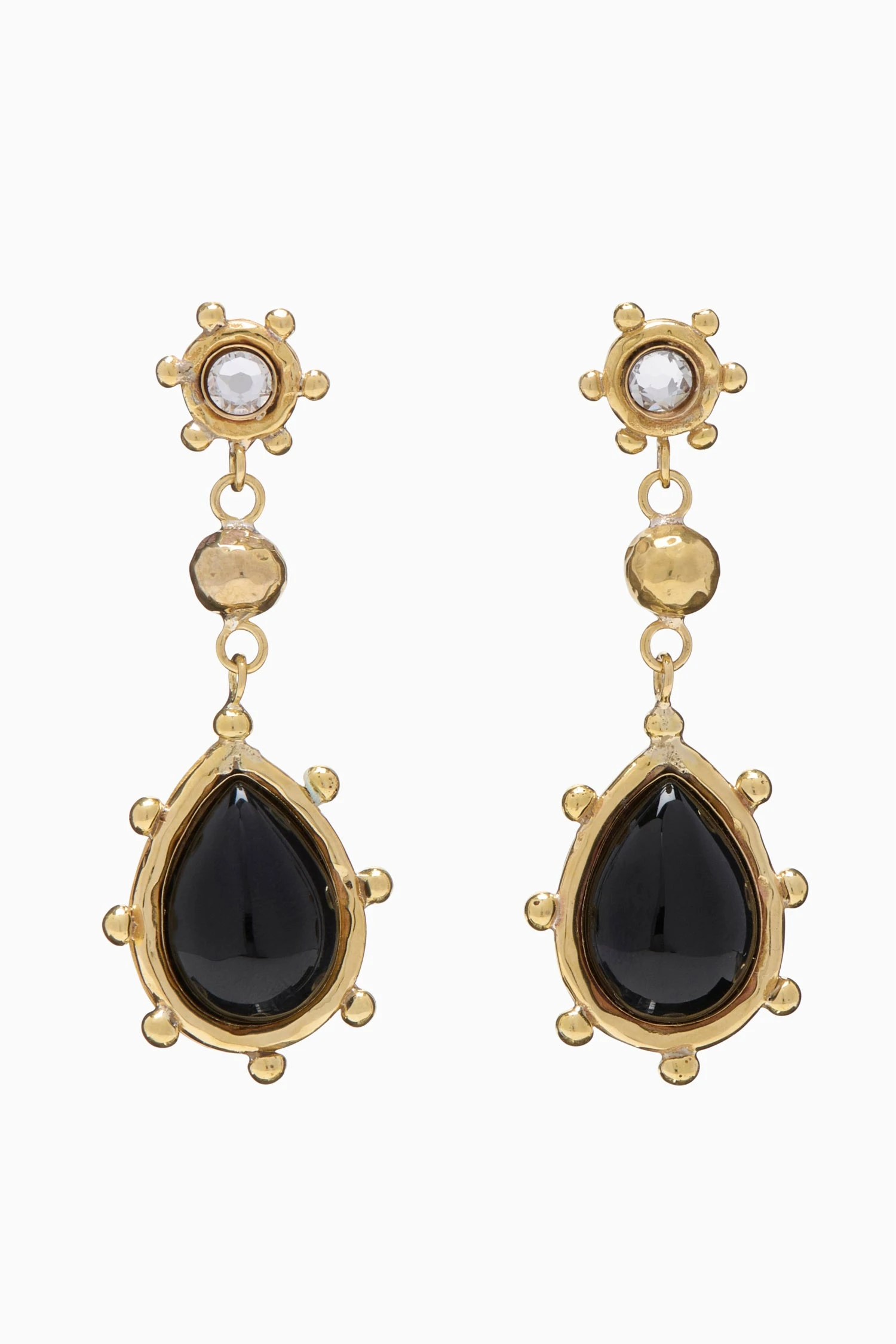 The Kaja Earring is a striking mix of metal and stones, hand-hammered by artisans in Kenya from brass with mini granulations and inlaid with a polished onyx gemstone. A single Swarovski crystal, part of our collaboration with the storied jeweler, gleams at the top.