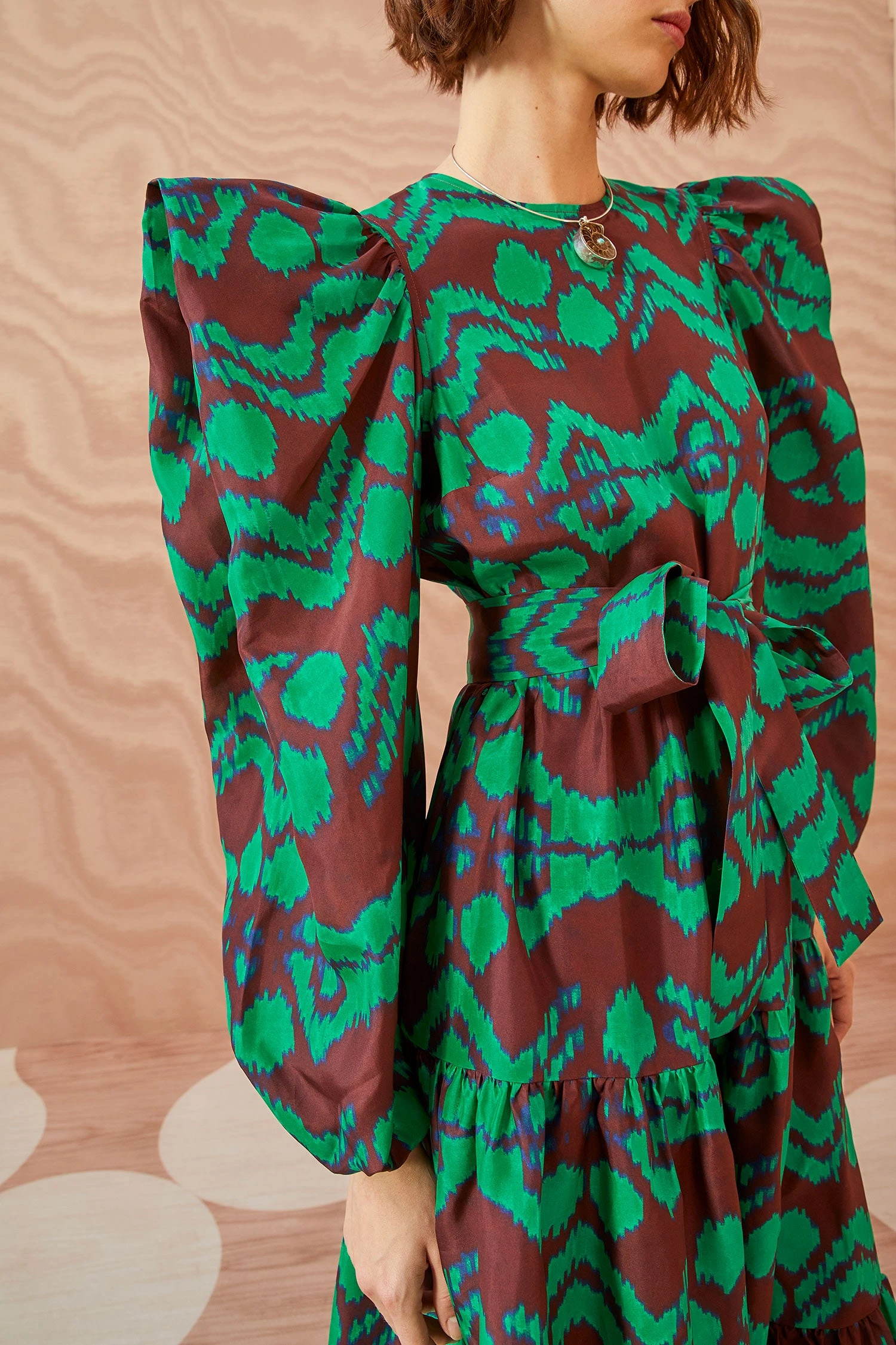 The Kasssandra Dress is crafted from silky taffeta decorated with our graphic ikat motif in vibrant emerald green and rich brown. This midi-length dress is framed by statement puff sleeves and has an optional tie belt to cinch your silhouette. It is finished with a hidden center-back zipper.