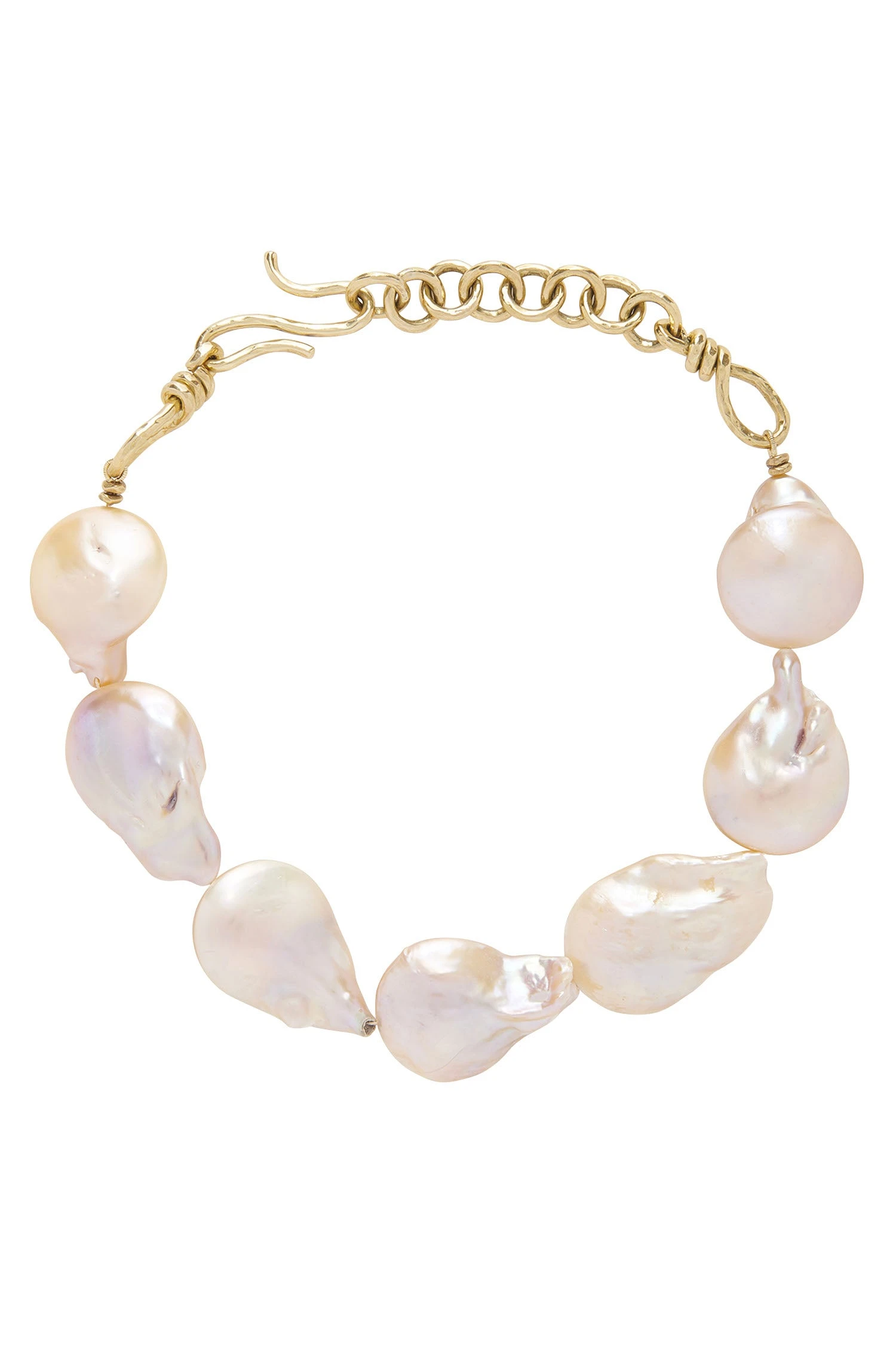 As featured in Look 23 of our Autumn/Winter ’23 Runway Show, the Oversized Pearl Necklace is crafted from freshwater pearls in organic shapes. This choker style accessory is finished with granulated spiral caps at the closure.