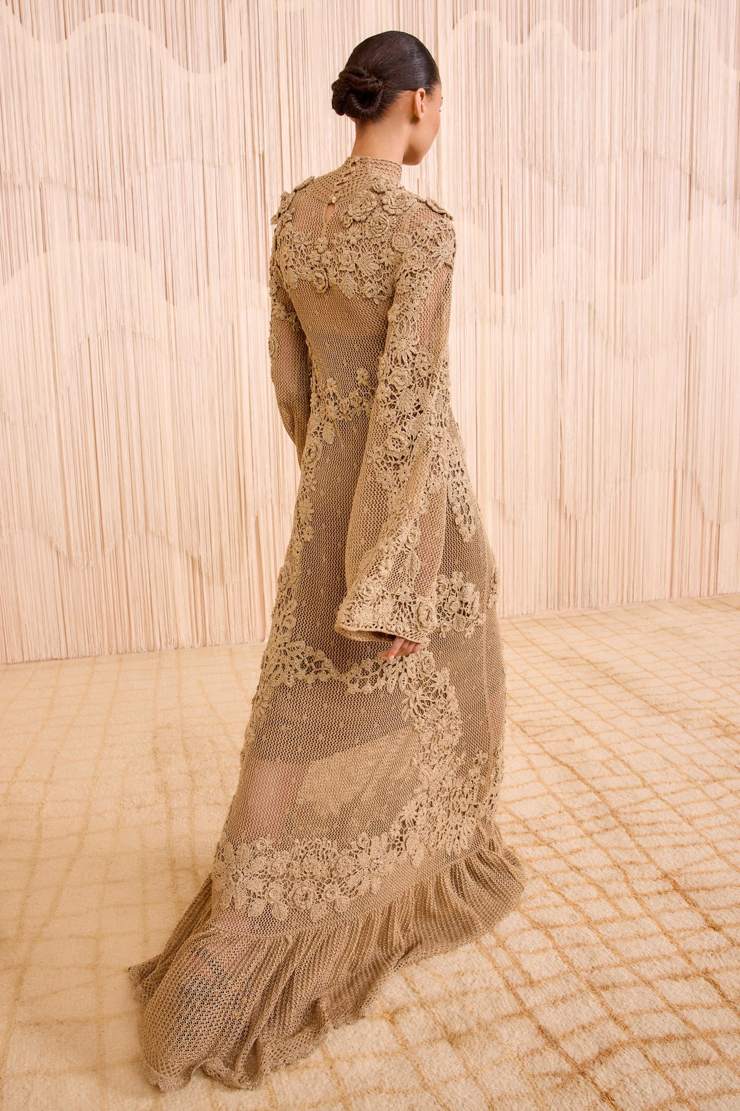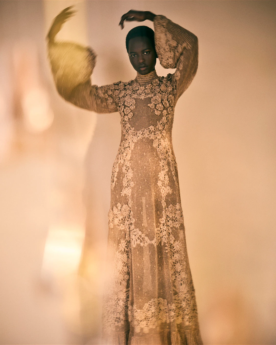 Floating down the AW25 runway in Look 48, the Leah Dress is a standout silhouette knitted with lurex for a shimmering finish. This semi-sheer, beige dress comes alive with bursts of hand-crochet florals that cascade throughout, while the bell sleeves and generously gathered hemline create mesmeric movement at every step.