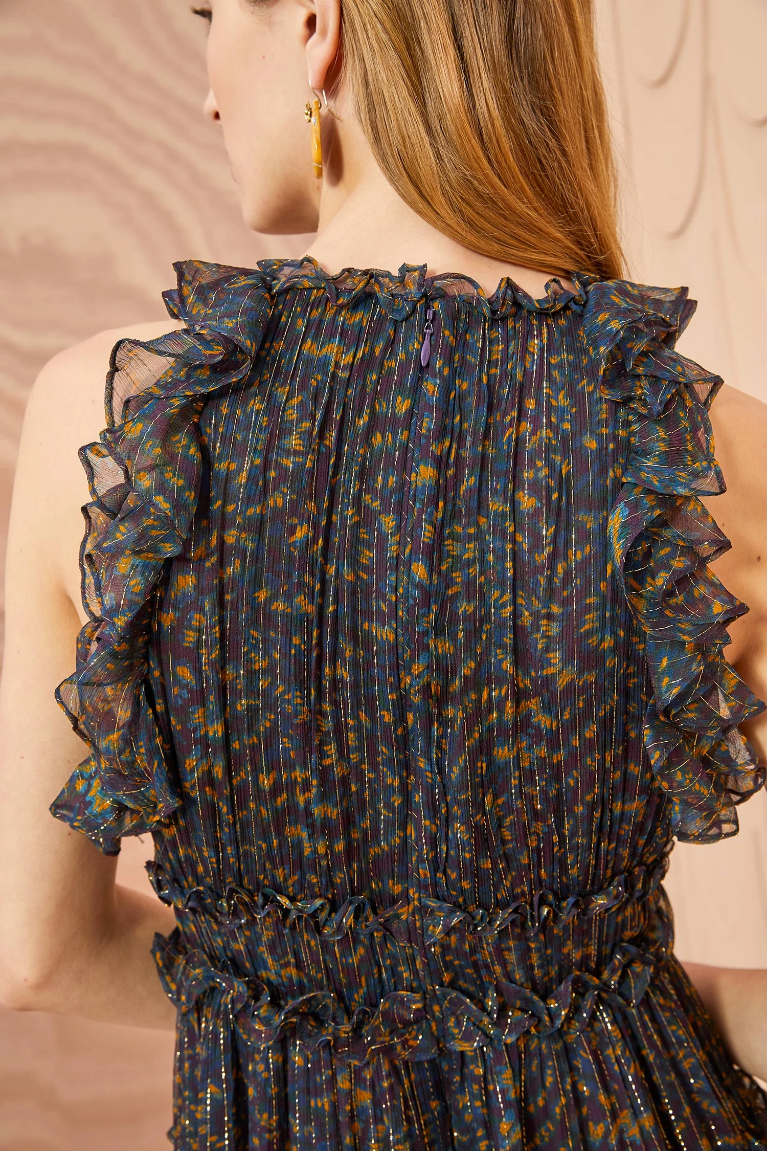 This occasion-ready Lirra Gown is crafted from whisper-thin silk crinkled chiffon that’s woven with lurex thread and has a gorgeous micro leopard-print with pops of gold. This ethereal floor-length gown is gently ruched at the bodice and is adorned with curling ruffle trims. It is finished with a hidden center-back zipper.