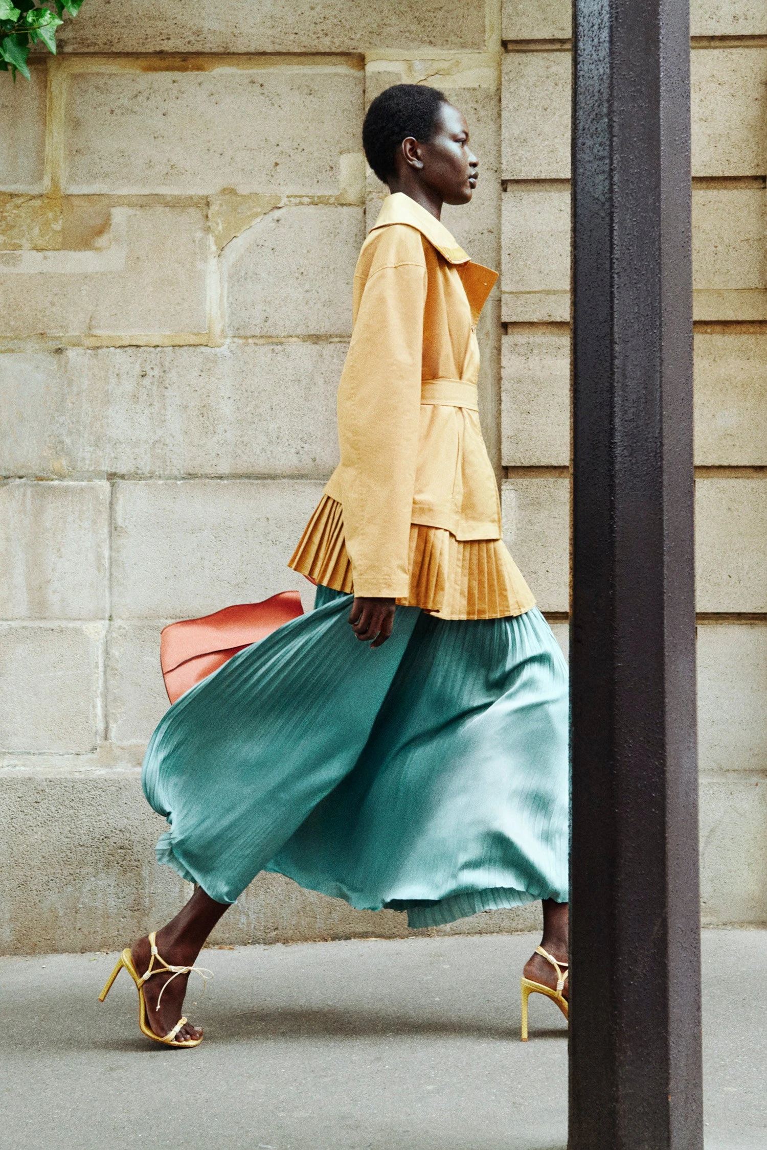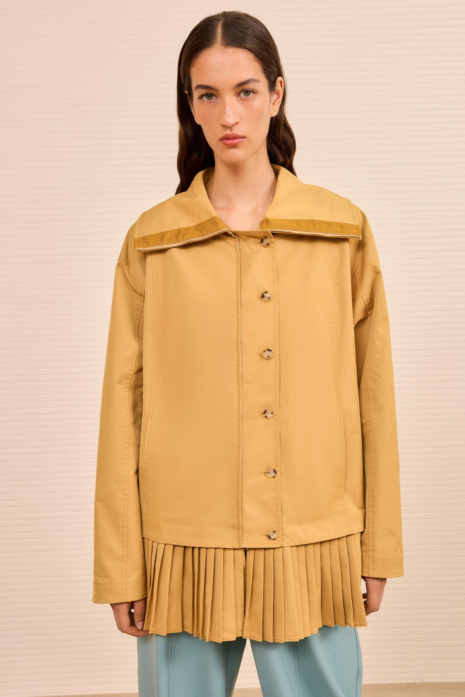 Balancing femininity with utility, the Lison Jacket is tailored from lightweight nylon with an elongated collar and a burst of pleating at the hem that creates a trompe l’oeil effect. This neutral yellow layer can be worn unbelted for a relaxed fit or cinched for more definition.