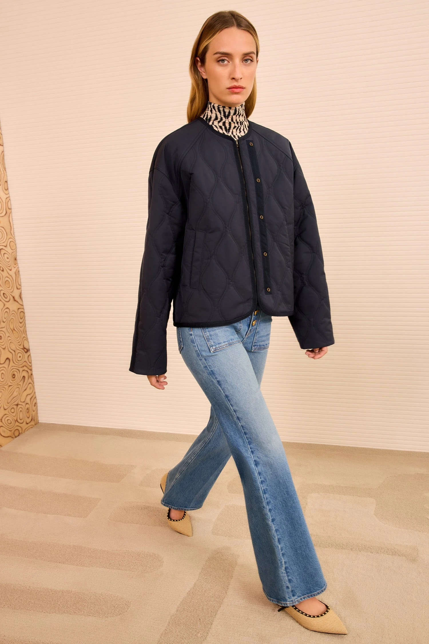 The Malone Jacket is a nylon outerwear essential in rich midnight blue. Quilted throughout, this jacket has a clean, collarless silhouette and an oversized fit ideal for layering.