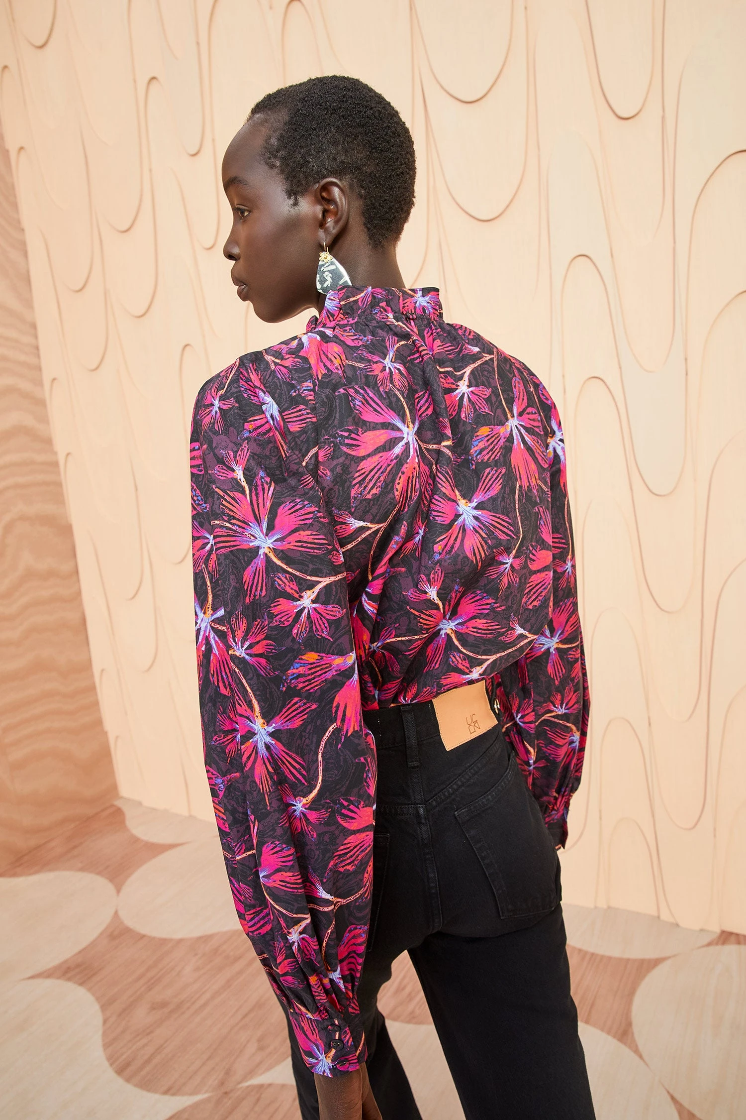 The Marlie Blouse is crafted from our moonflower printed poplin with hyper-saturated pigments of magenta and hyacinth set against a swirling black background. This elegant floral blouse features full long sleeves, buttoned cuffs, and delicate ruffles at the high neck.Â
