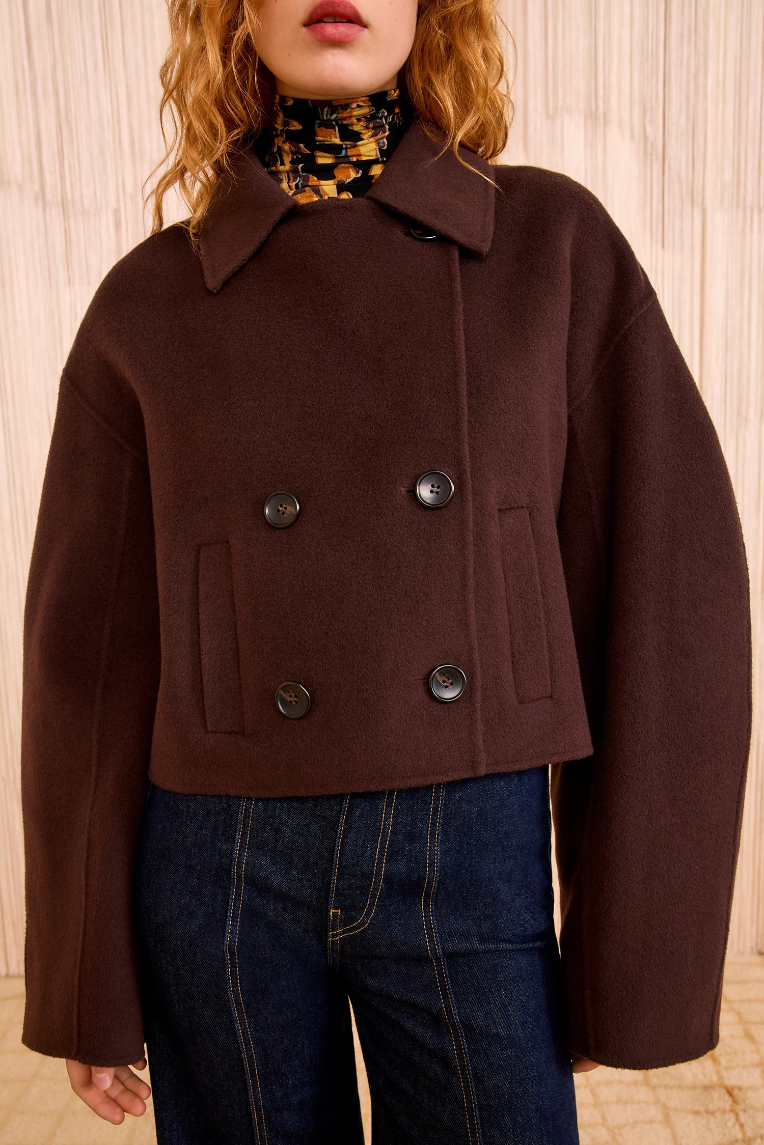 The Marta Coat features a cropped, sculptural silhouette that’s modern and elegant in equal measure. Impeccably cut from double-faced wool, it features a double-breasted front that buttons all the way up and is a rich and versatile brown.