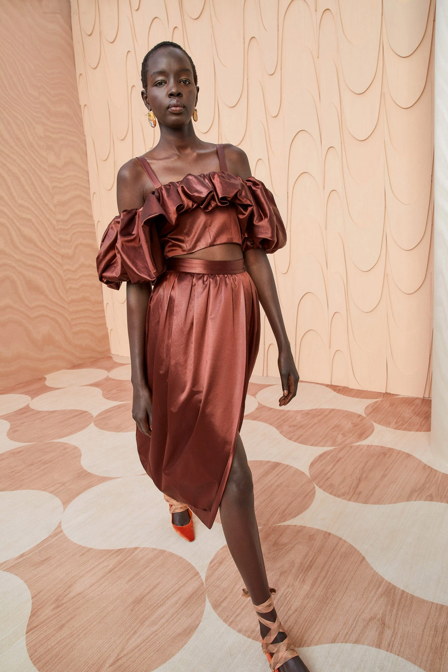 As featured in Look 48 of our Autumn/Winter ’23 Runway Show, the Maxine Skirt is made from Italian cotton-blend suiting, finished with a glossy sheen to enhance its opulence. This mahogany midi-length skirt is designed with a gorgeous tulip-style silhouette, fixed waist, and a side-seam zipper.
