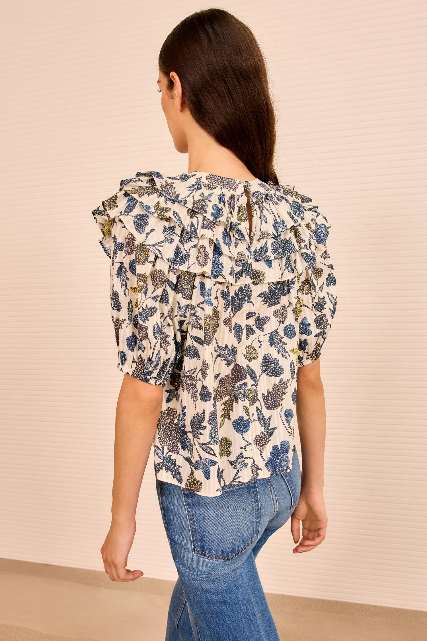 The Mira Top is an effortless layer that blooms with batik florals atop softly graphic stripes. Crafted from lightweight cotton-blend, this multicolored style is framed by artfully puffed sleeves and is finished with gestural ruffled tiers.