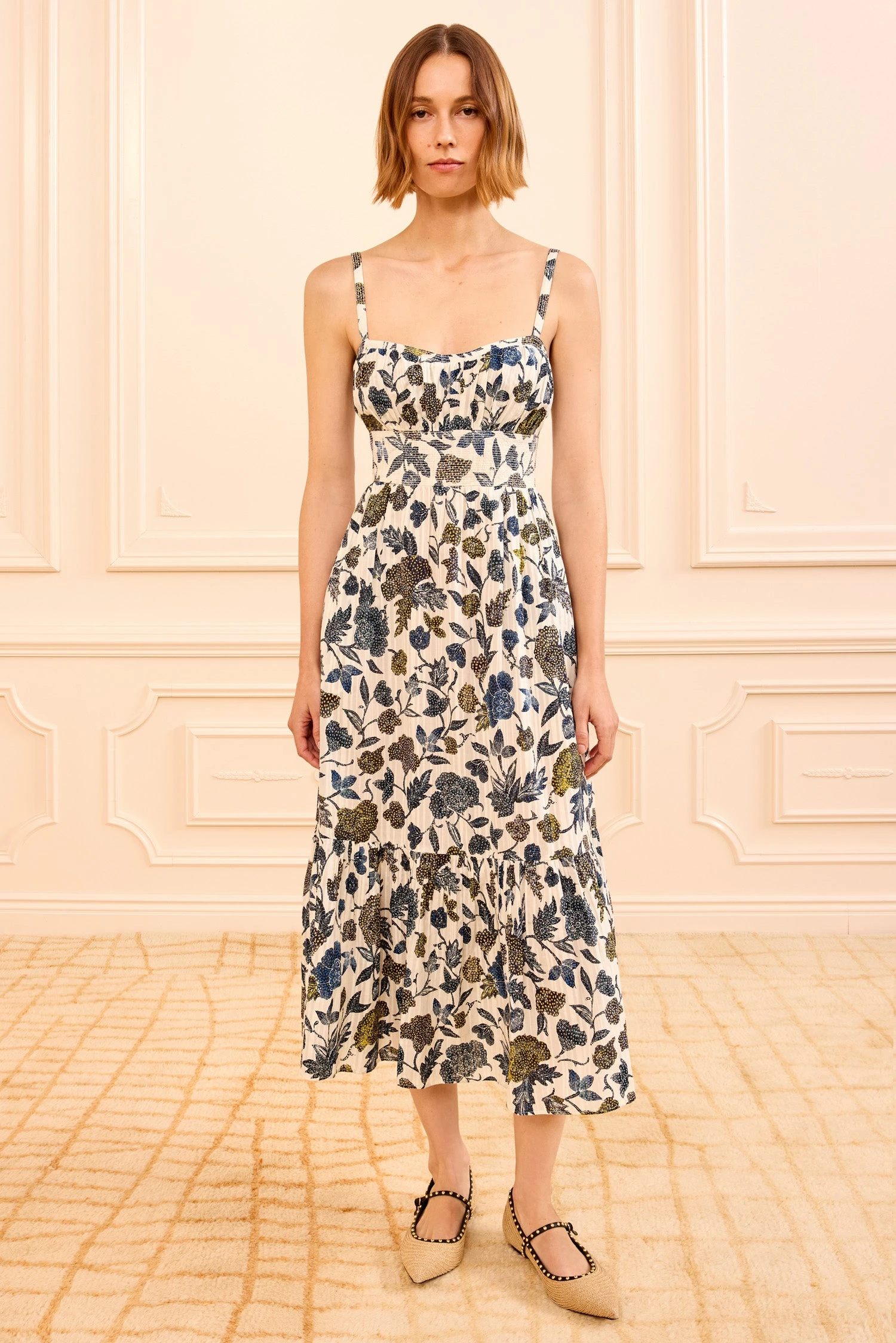 The Nadine Dress is adorned with a textured, batik floral print set atop subtle stripes. This wear-anywhere, multicolored dress is made from cotton-blend with a sweetheart neckline that flatters the form and floats to a midi hemline.