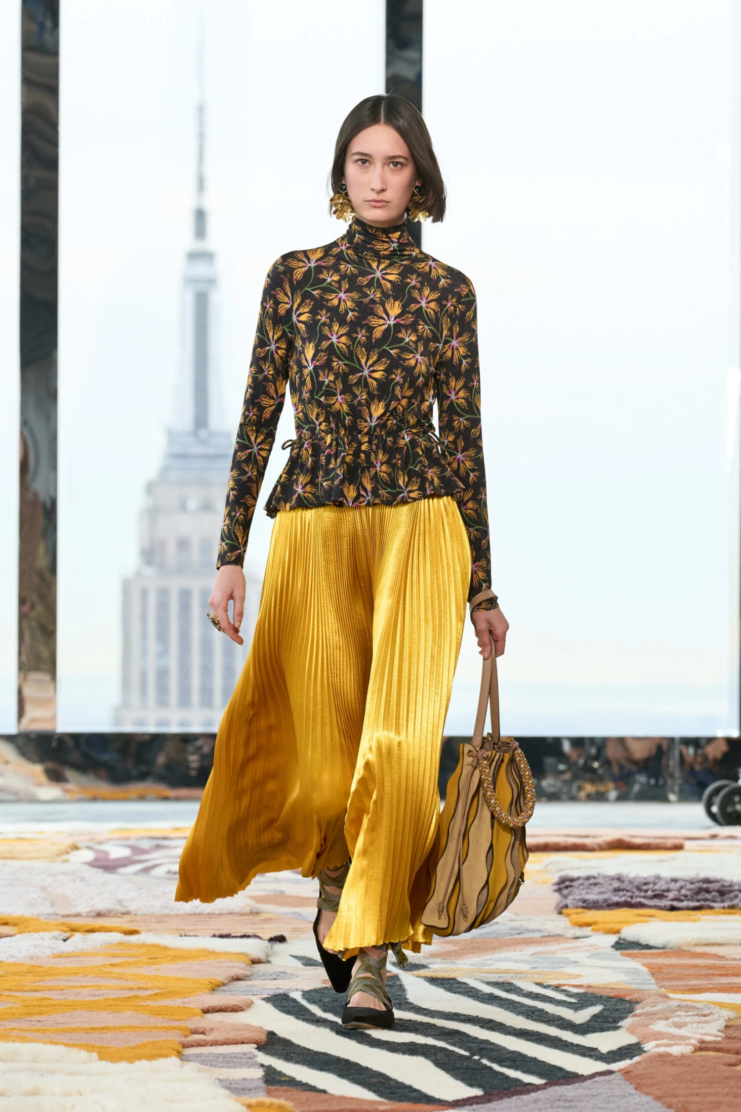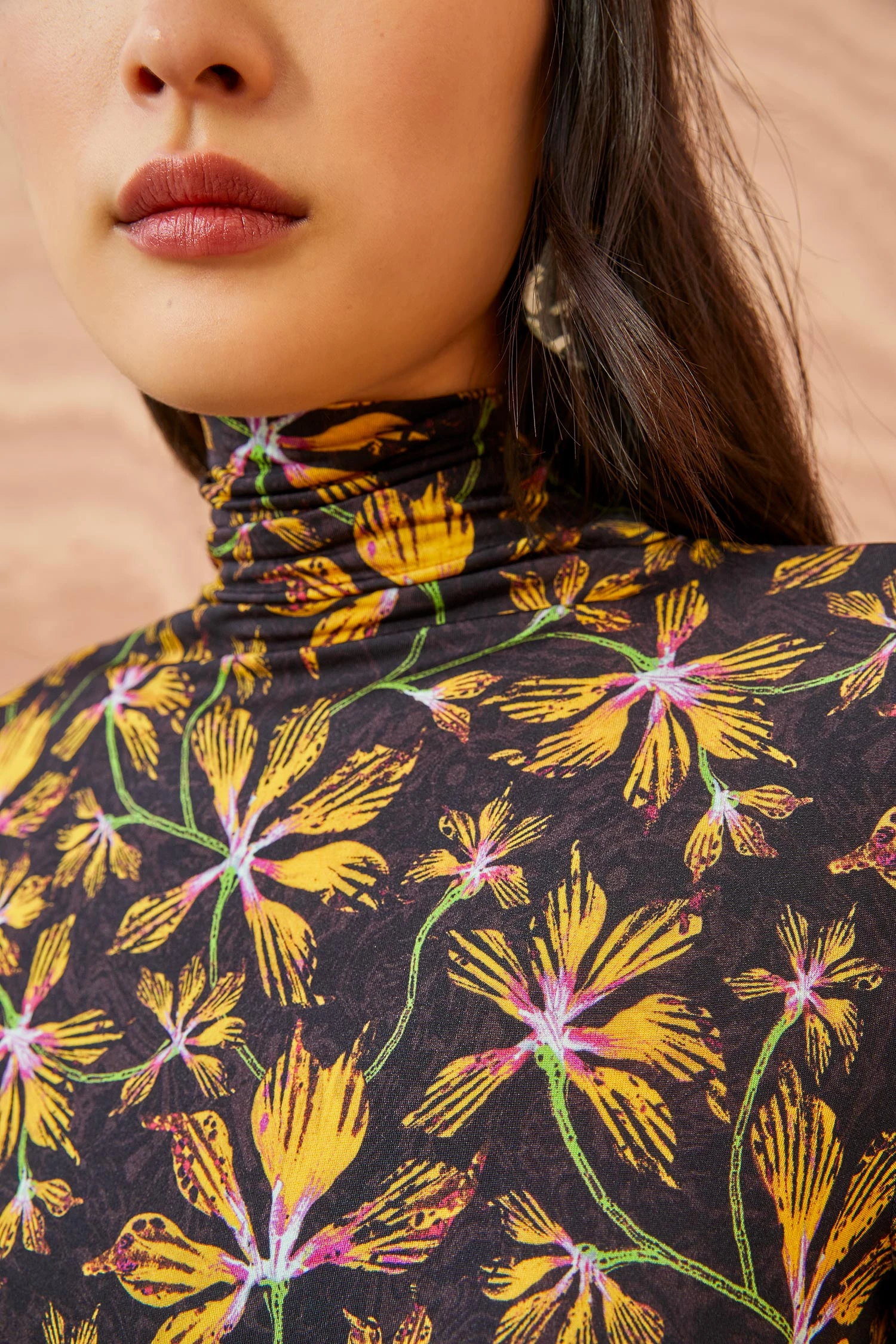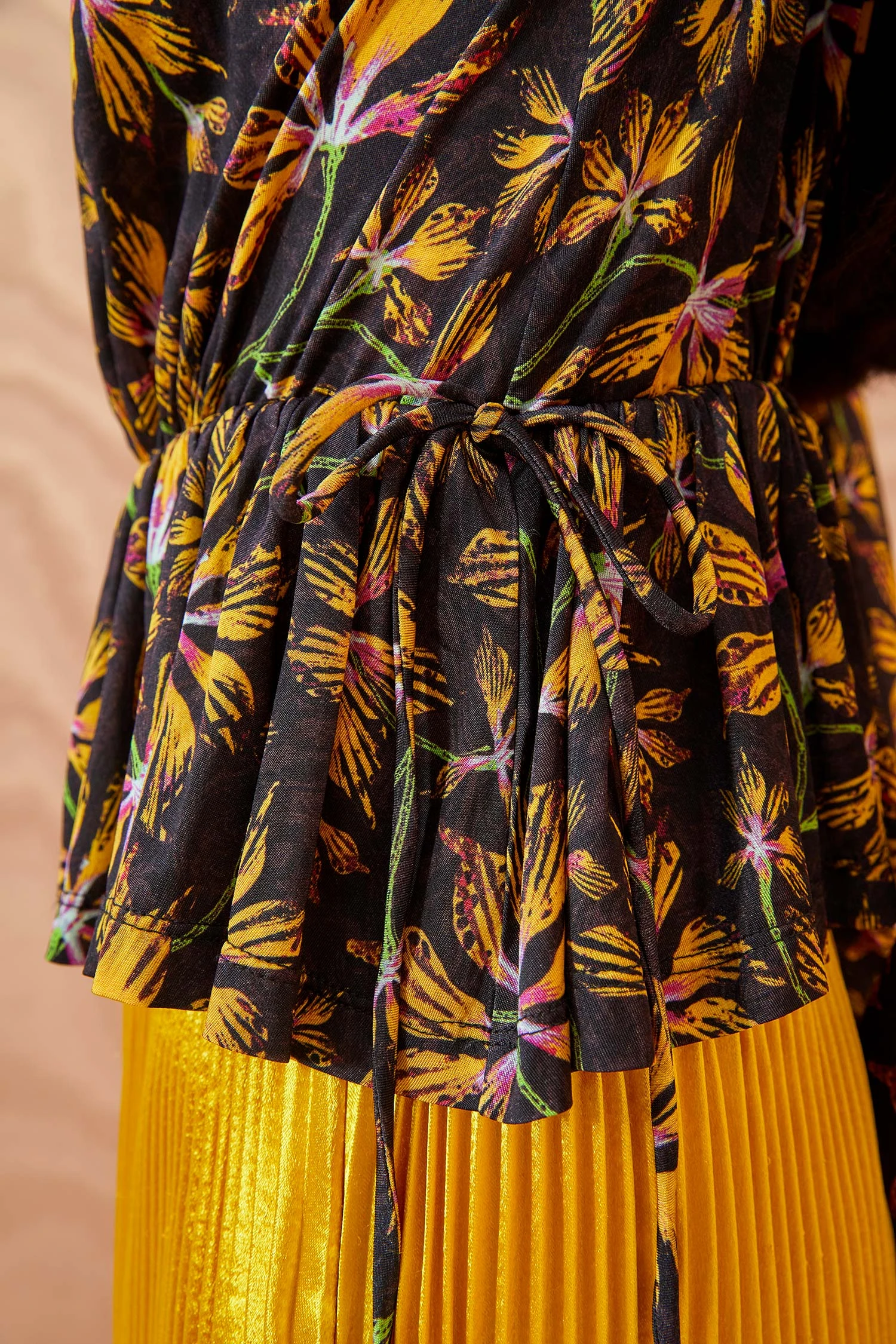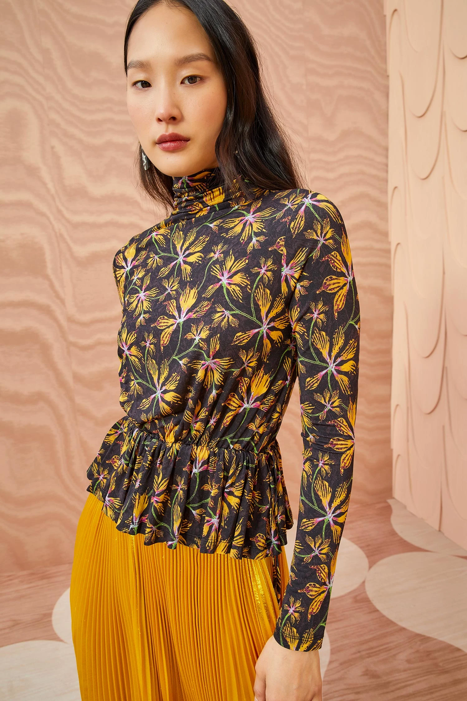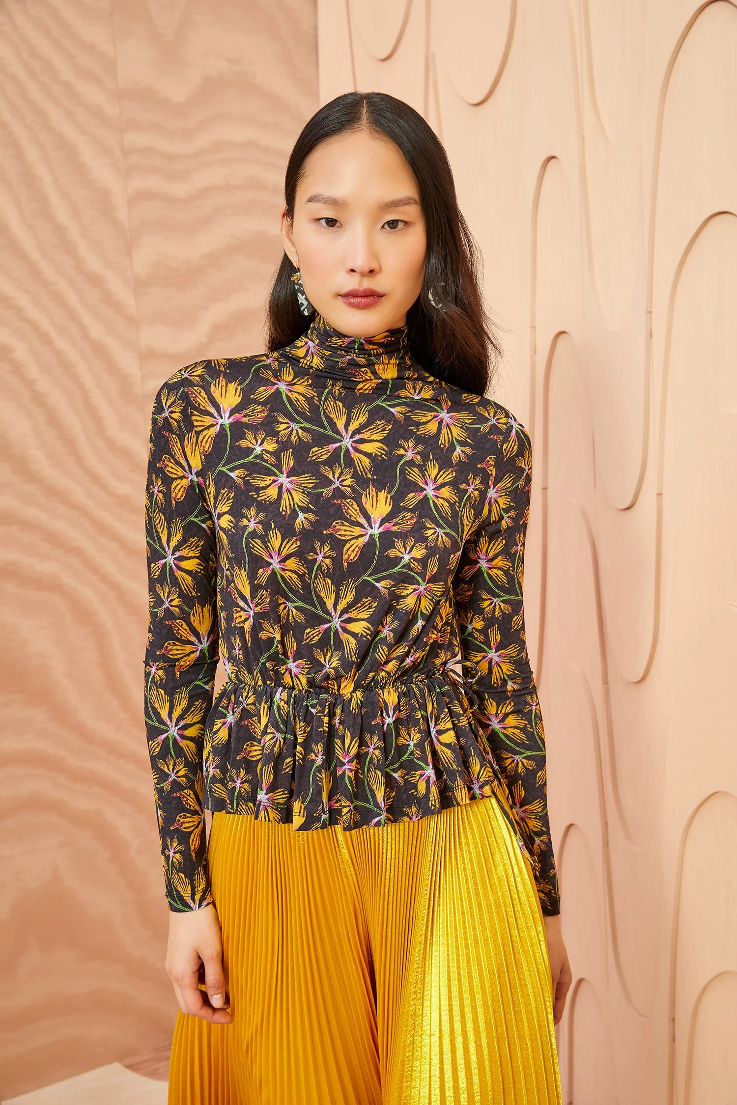 As featured in Look 30 of our Autumn/Winter ’23 Runway Show, the Nina Top is made from our silken draped tricot jersey and printed in this season’s favorite graphic florals with pops of yellow and pink. This lightweight long-sleeve top features a ruched waistband with drawstring ties and a peplum hem.