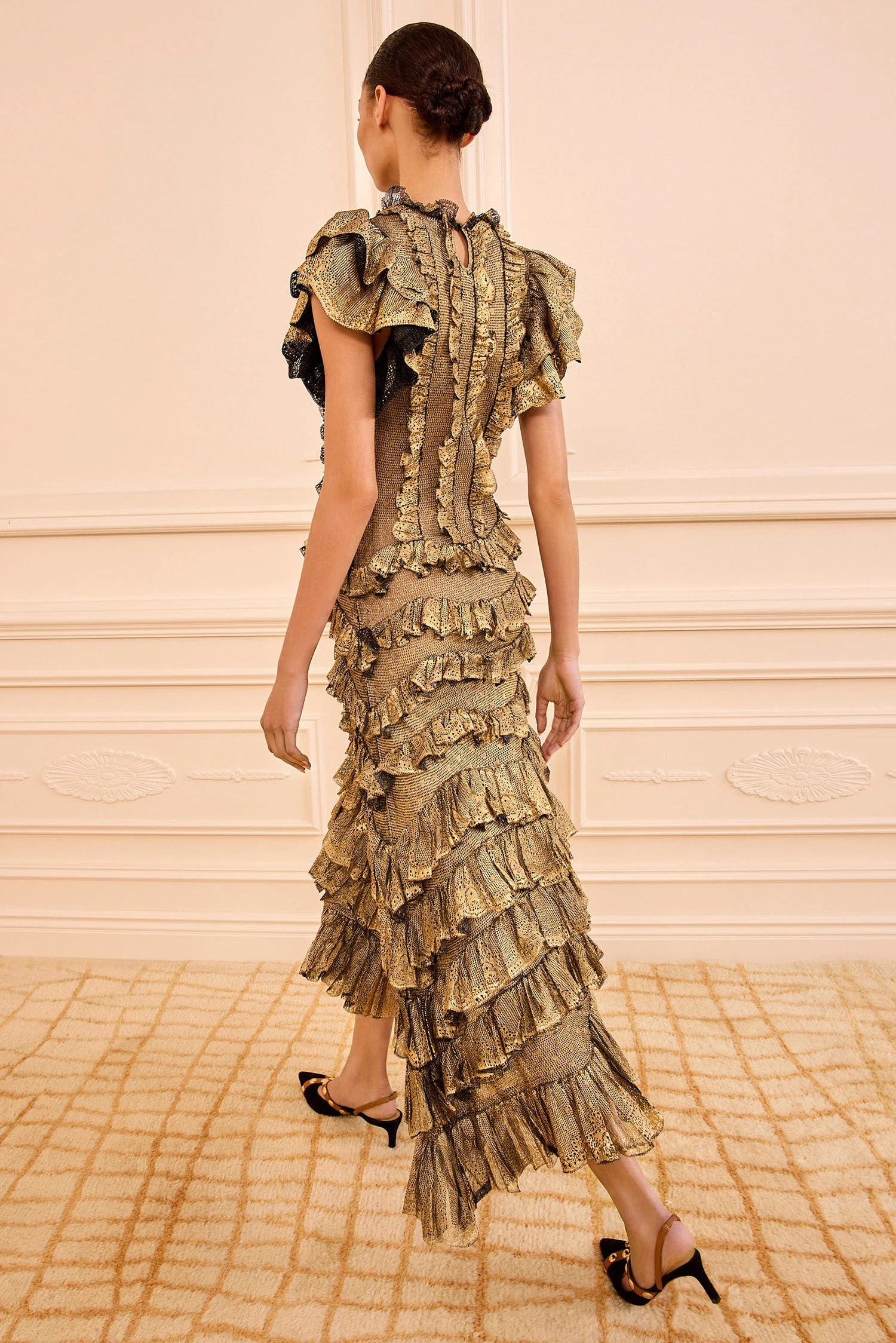 The Ondine Dress breathes with gesture created by a point d’esprit knit applied with swathes of wavy ruffles inspired by Chantilly lace. This gold, event-ready dress skims the form and is underpinned with a slip lining.