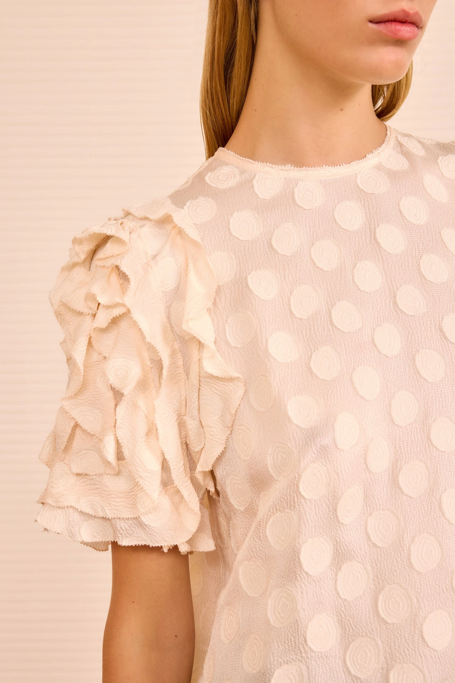 The Opal Top is a tonal, white silhouette alive with fil coupé dots scattered across a light chiffon. It has a relaxed bodice that’s contrasted with puffed sleeves adorned with lively, cascading ruffles.