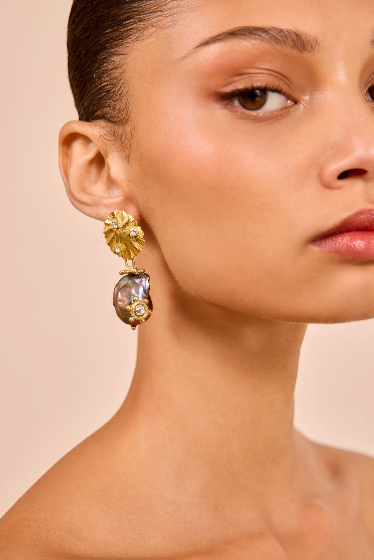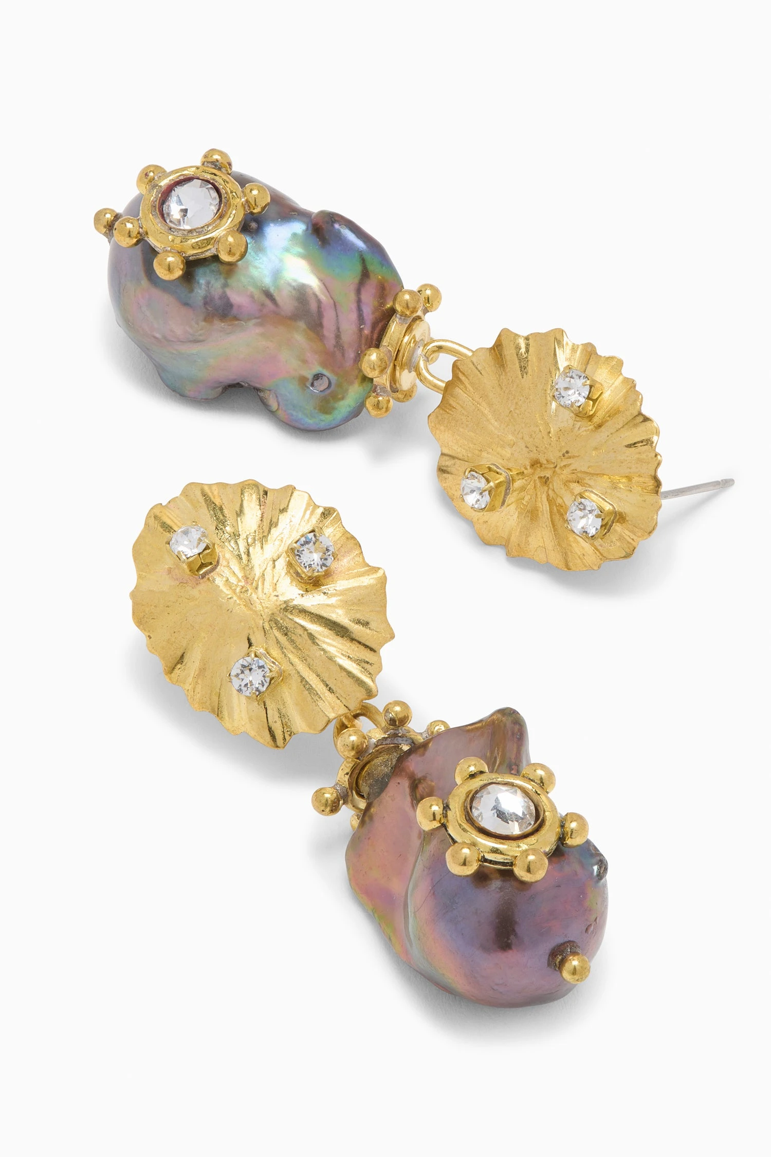 Alive in organic beauty, our drop earrings are meticulously hand-hammered from brass into the shape of a natural seashell and inlaid with Swarovski crystals, part of our collaboration with the renowned jeweler. They are accented with peacock baroque pearls of singular iridescence.Â