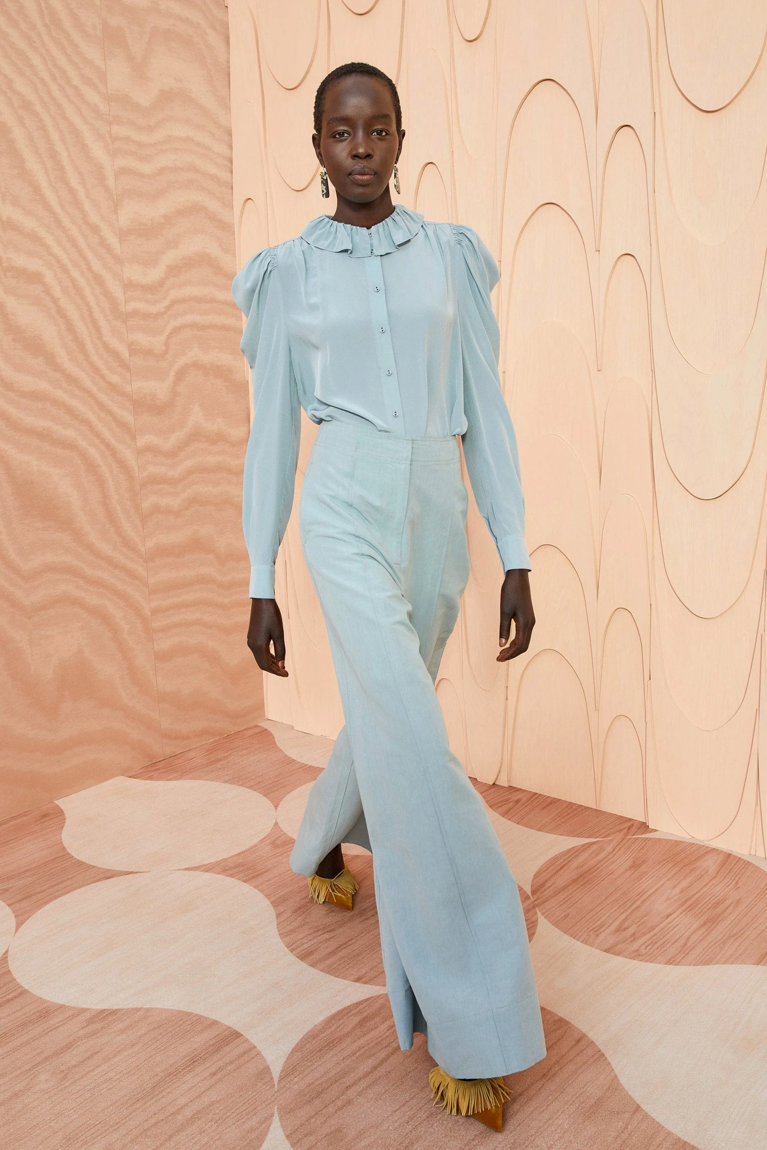 As featured in Look 36 of our Autumn/Winter ’23 Runway Show, the Polina Pant is made from our signature suiting fabrication in a soft shade of slate-blue. These high waisted wide-leg pants feature a single front pleat and are designed without a waistband for a sleek finish.