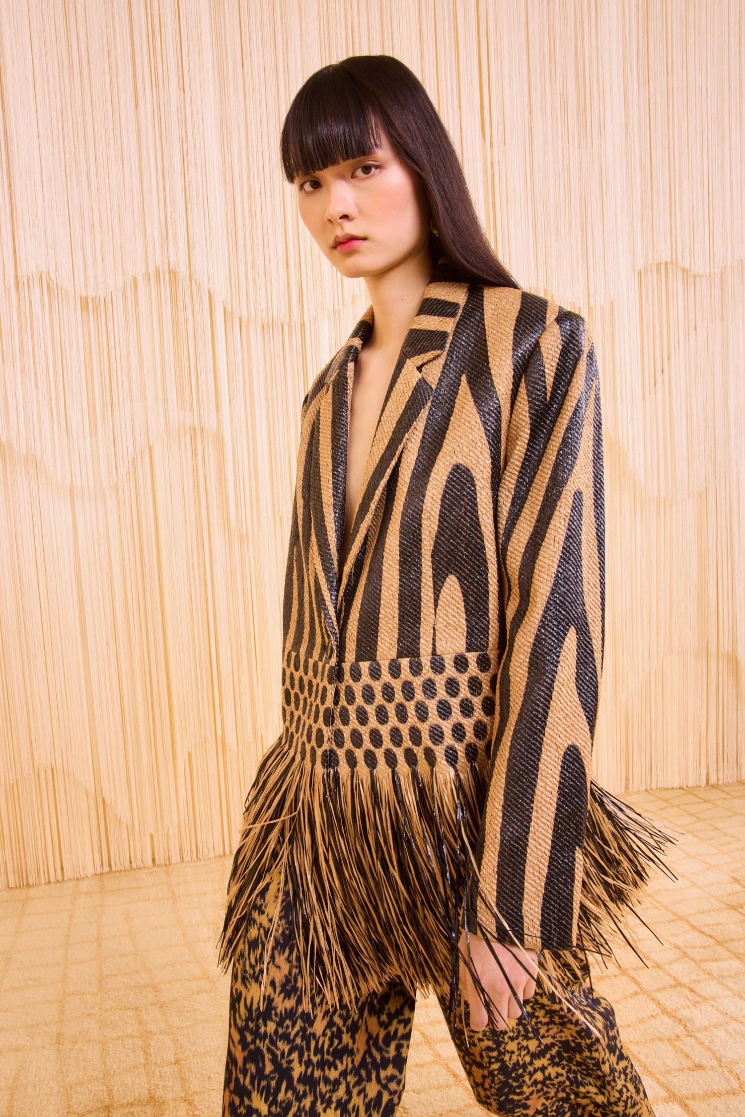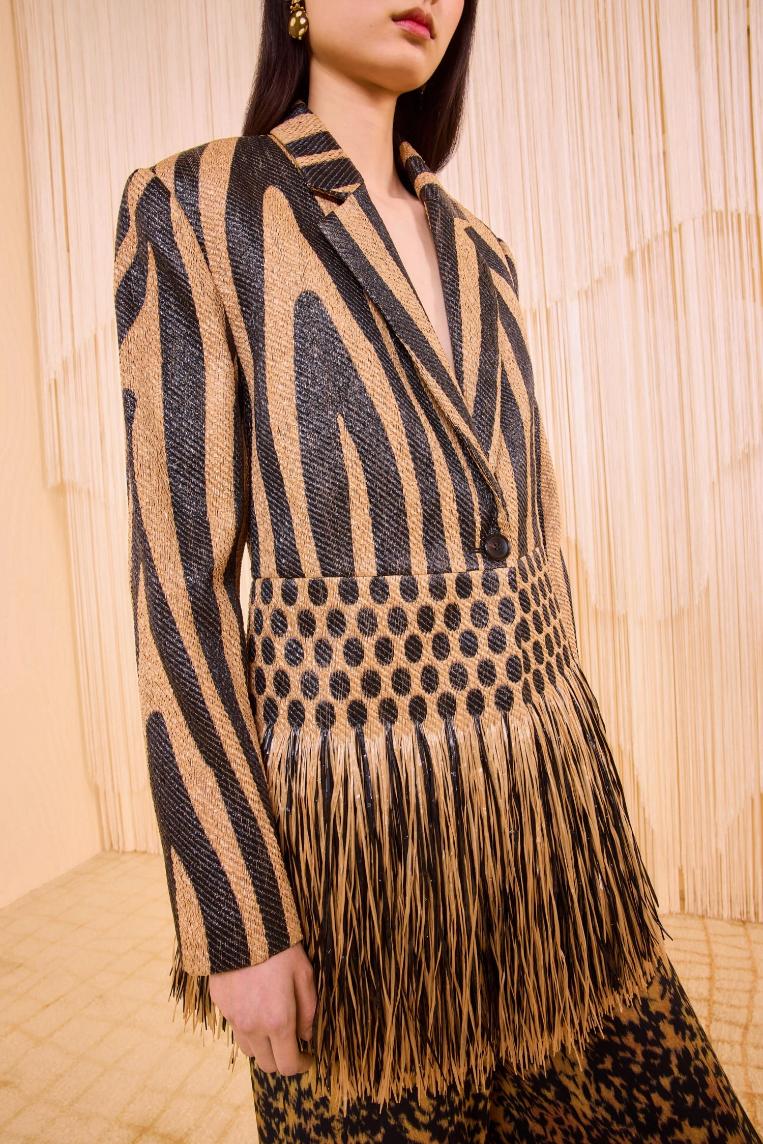 Our exclusive Priya Blazer makes a statement in Italian jacquard with graphic liner and dotted motifs, alive at the hem with lush fringe reminiscent of natural raffia. Perfect for elevated moments, this black and sand blazer has classic notch lapels with a plunging neckline and is designed to be elegantly oversized. It fastens with a sleek, single button at the front.