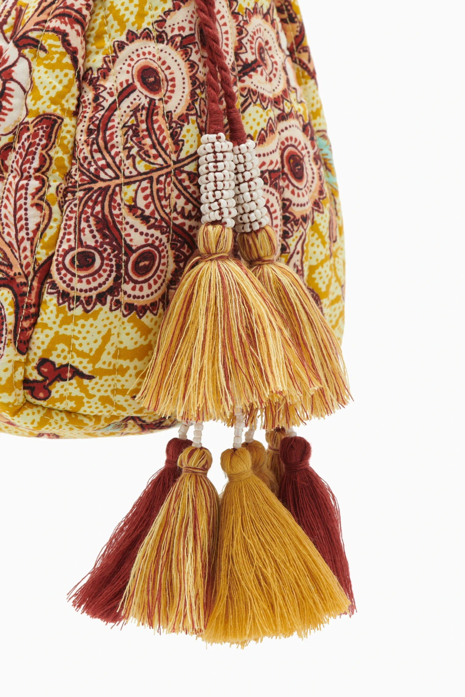 An Ulla Johnson exclusive only available in our stores or on our website, the Priya Makeup Bag is redesigned this season in our brilliantly-hued quilted Delphinium Calla Lily. This mini cylinder makeup bag features handmade beaded tassels, inner pockets, and a zipper closure.