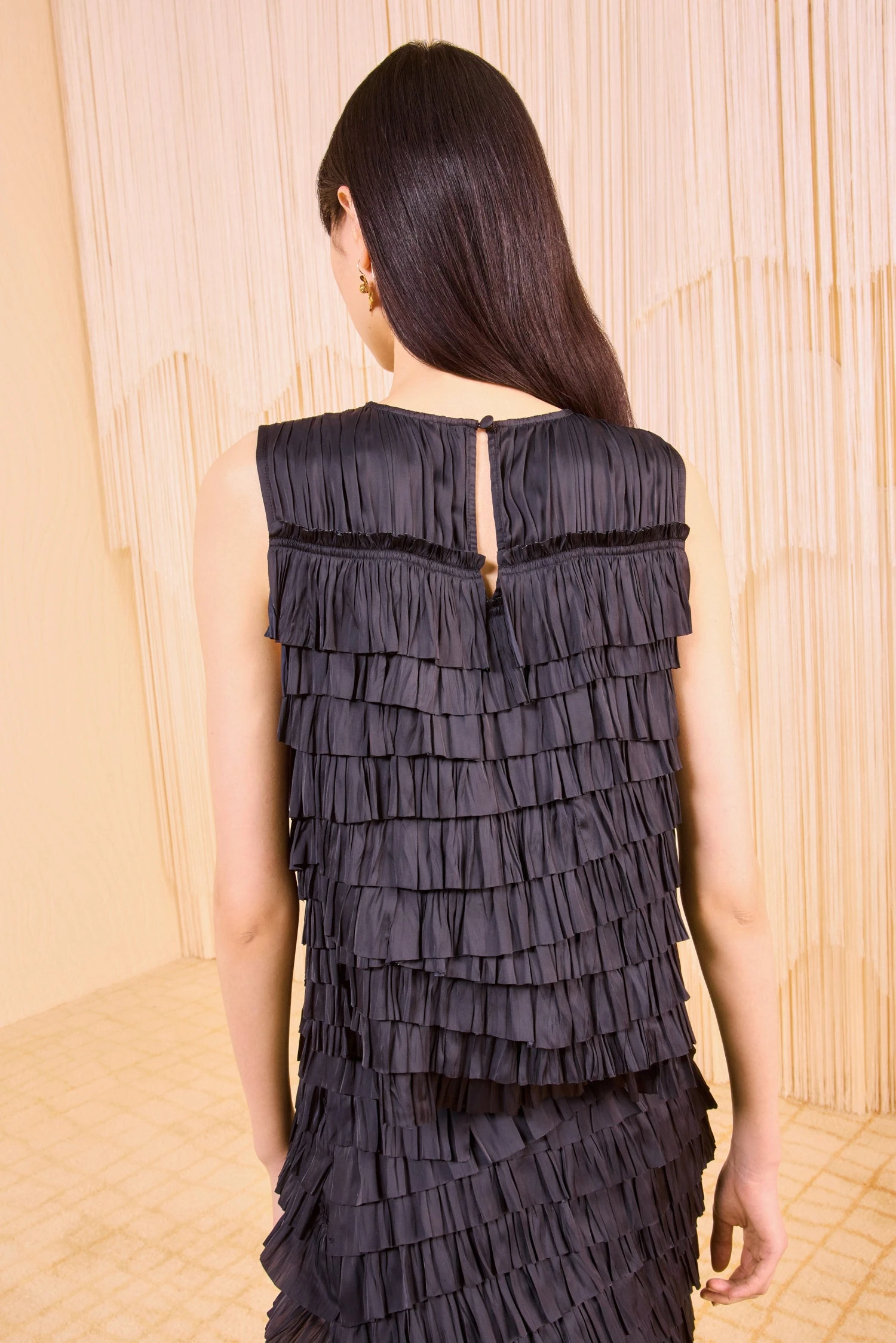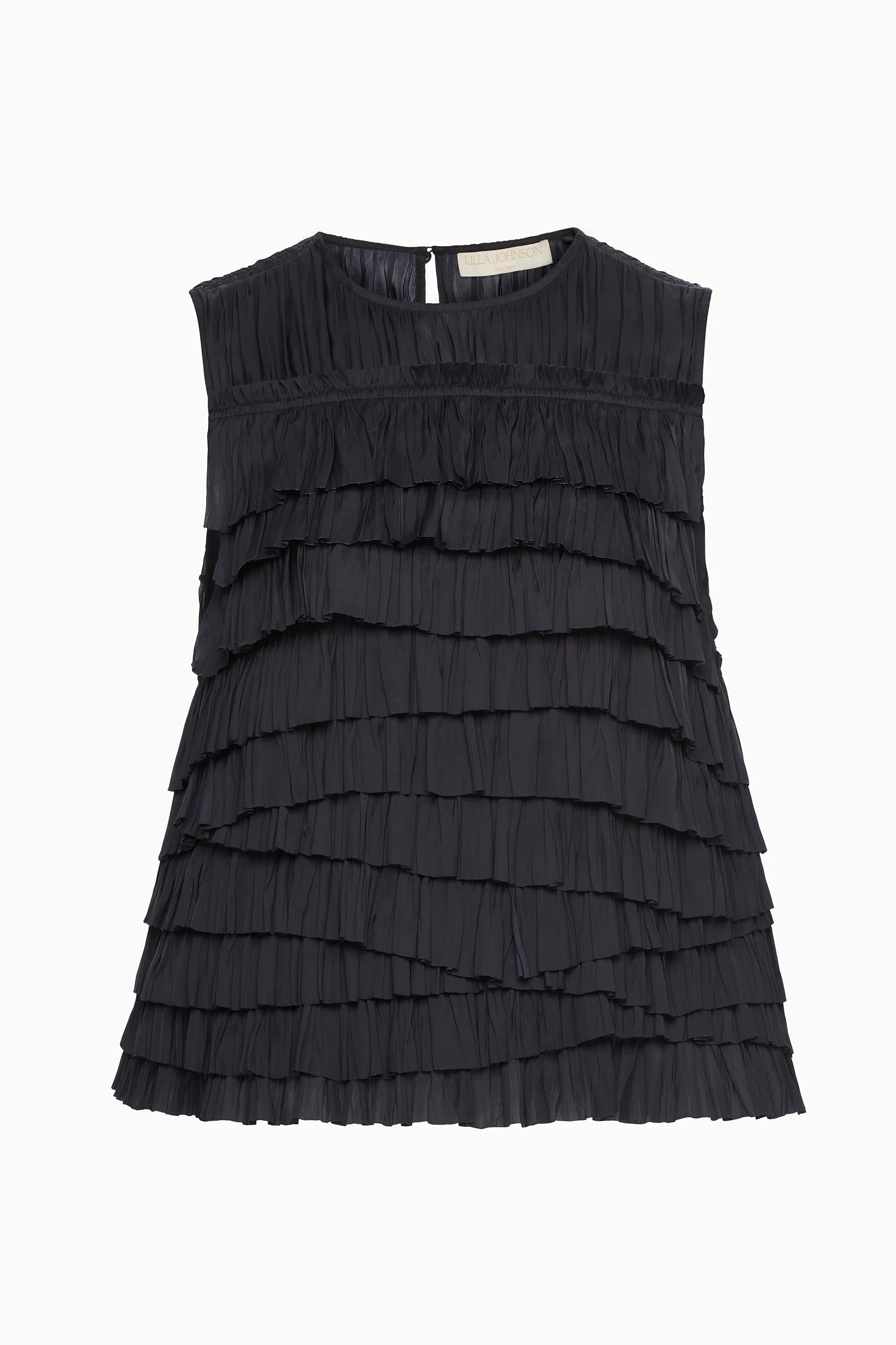 Crafted from plissé satin with a subtle sheen, the Quinn Top is constructed from tiers of crinkled ruffles that cascade beautifully. It has a sleeveless silhouette with a round neckline and is cut for an effortless fit with a simple button keyhole at the back. Coordinate this black top with our Eloise Skirt and gold jewelry for evenings out.