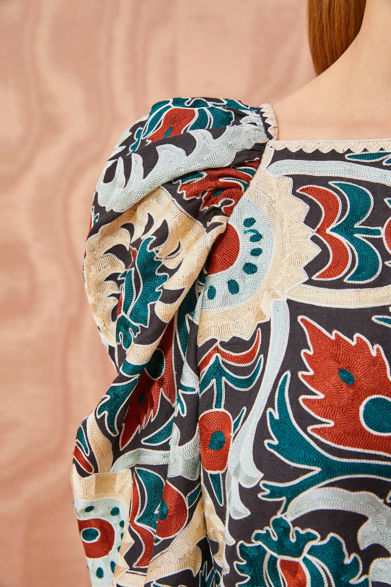 The Siya Blouse is a stunning silhouette crafted in our intricate chain stitch embroidery, featuring a pattern of blue-hued florals and vines. This special textile is inspired by one of Ulla’s personal vintage tapestries and is a true future heirloom. This long-sleeved patterned blouse has a straight neckline, puff shoulders and billowing sculptural sleeves.