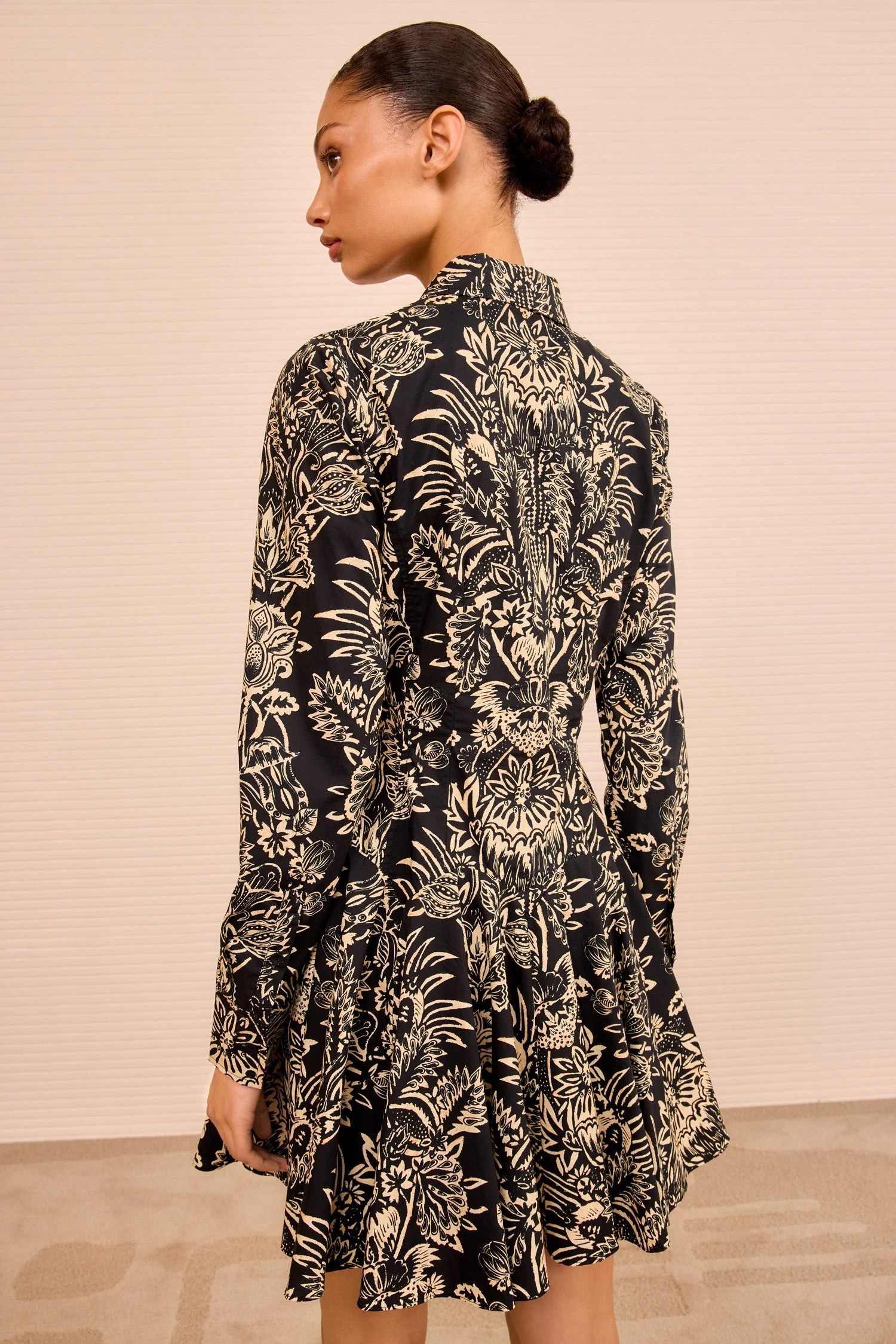 Richly graphic, the Taliah Dress is cut from poplin featuring a symmetrical floral leaf print with subtle, batik textures. This black and ivory dress has a shirt-inspired silhouette, with a classic collar and a mini hemline with godet pleats for elegant volume.