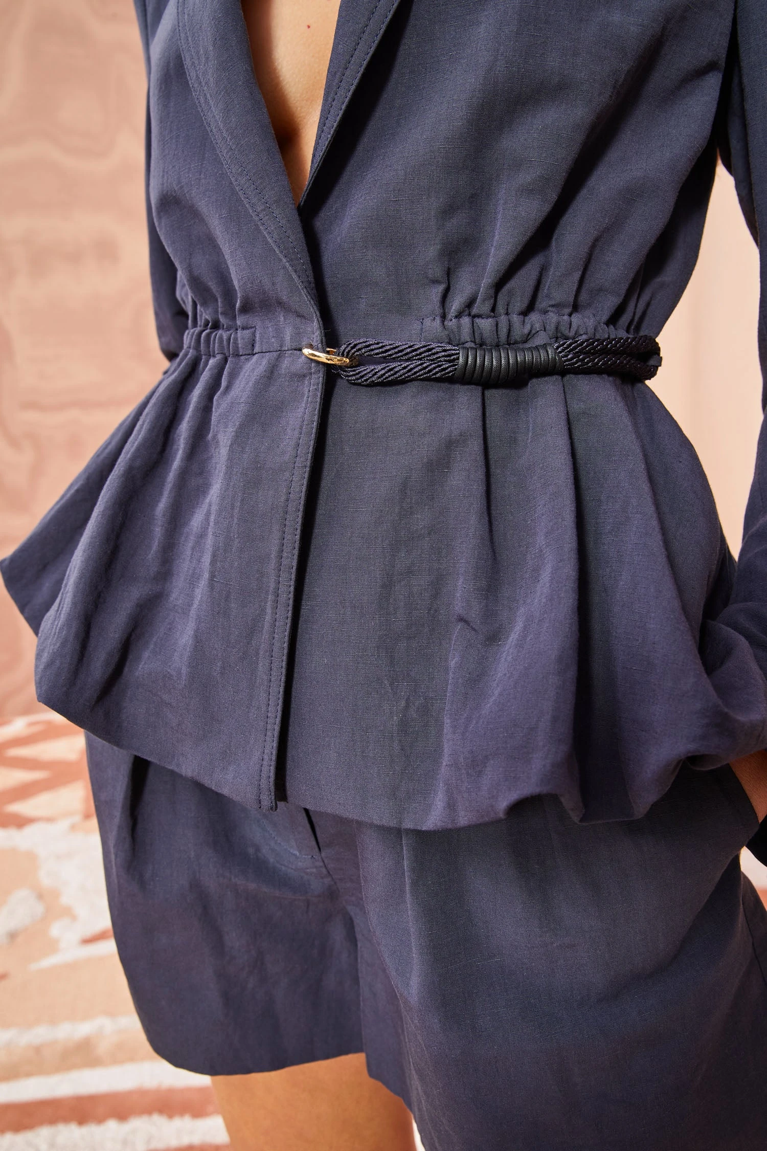 As featured in Look 19 of our Pre-Fall ’23 Lookbook, the Talie Blazer is a beautiful addition to our tailored suiting collection. This timeless navy jacket is crafted from our silk, cotton and linen textural slub fabric and features structural shoulders, tapered sleeves, and a modernized peplum waist. Finished with a striking looped rope and hammered brass ring closure.