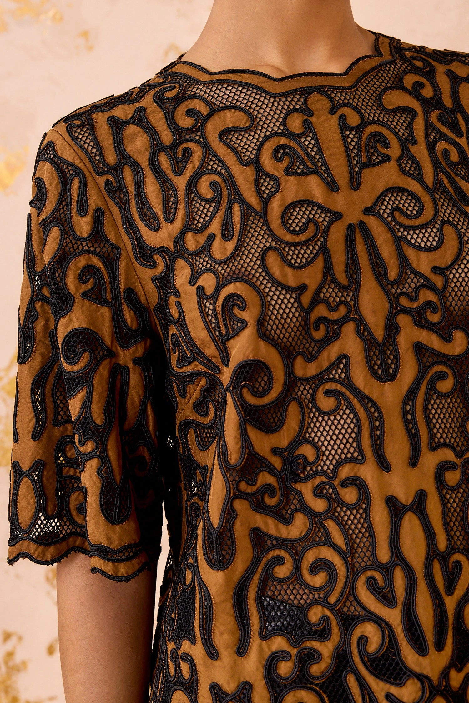 • Mesh appliqué, taffeta, and habotai
