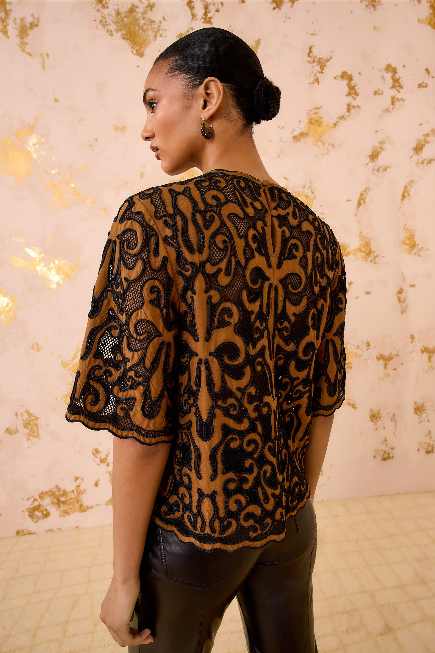 A play of sheerness and opacity, the Tasia Top is crafted from a Victorian-inspired embroidered appliqué, set against delicate black mesh with intricate taffeta patchwork in rich saffron. This ornate silhouette has a streamlined shape that easily elevates denim and tailored separates.