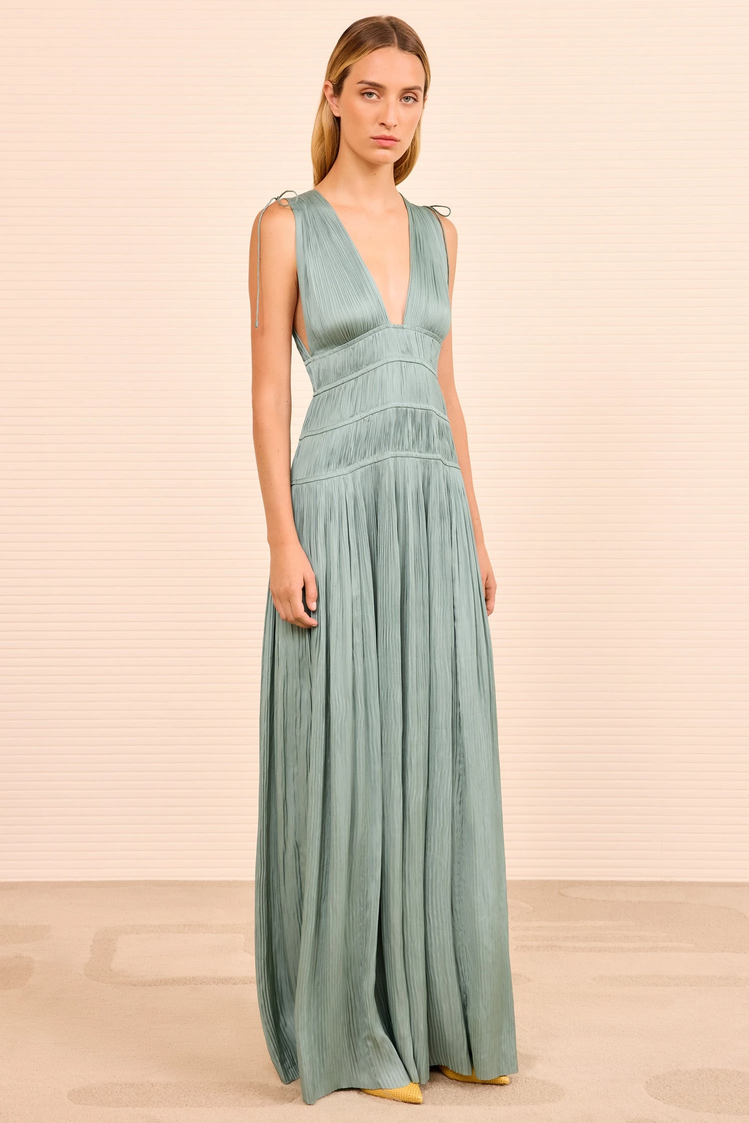 Refined in delicate green, the Tasneem Gown is an occasion-ready dress crafted from signature plissé satin that moves with organic fluidity. The silhouette is pleated throughout with softly structured gathering that embraces the form.