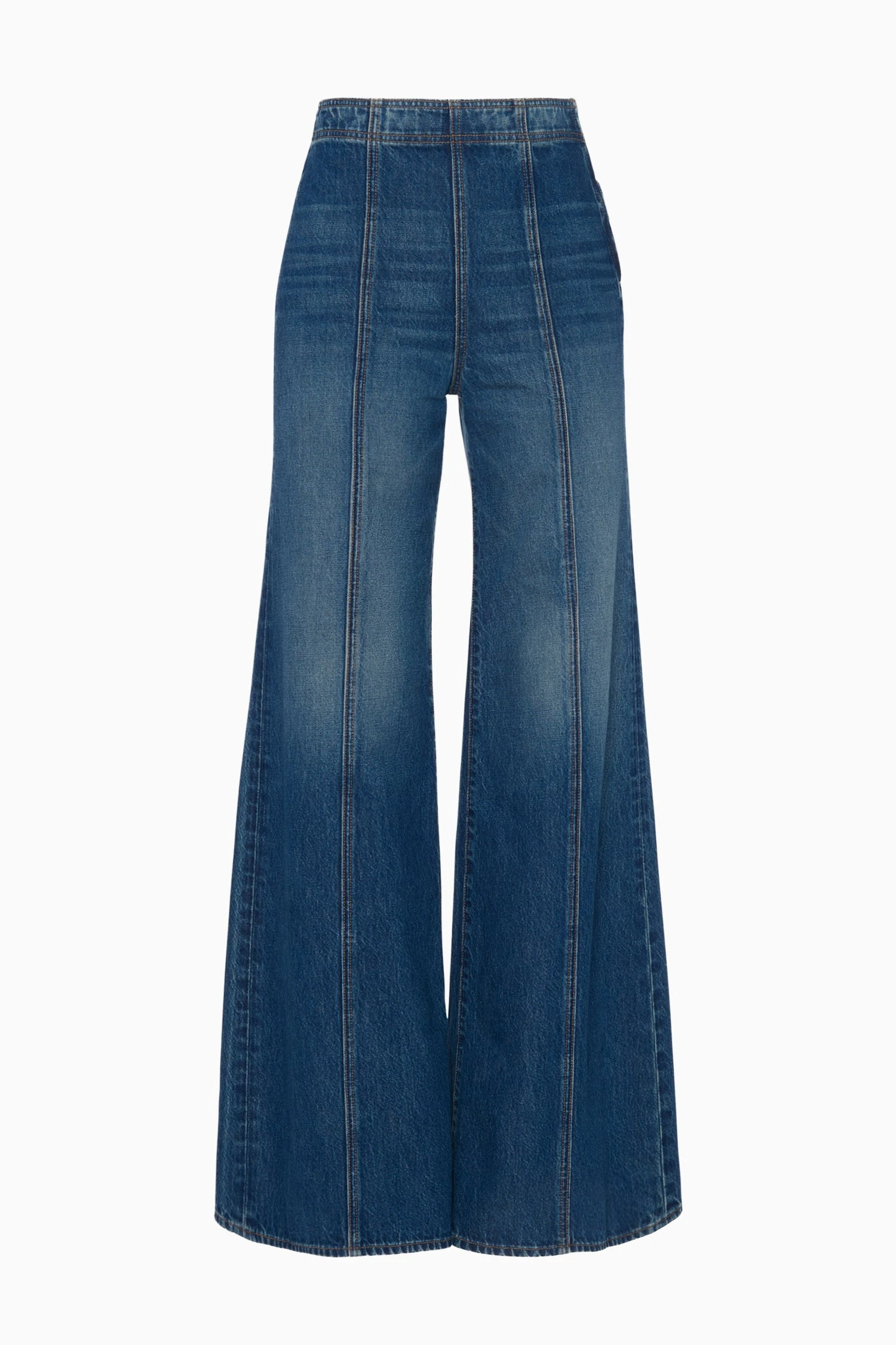 Elongating the form, the Bianca is a classic wide-leg design with center-front raised seams down each side and a Hollywood waistband that defines and flatters. It’s responsibly handmade from premium denim in a classic blue that’s sanded and whiskered for a lived-in feel.