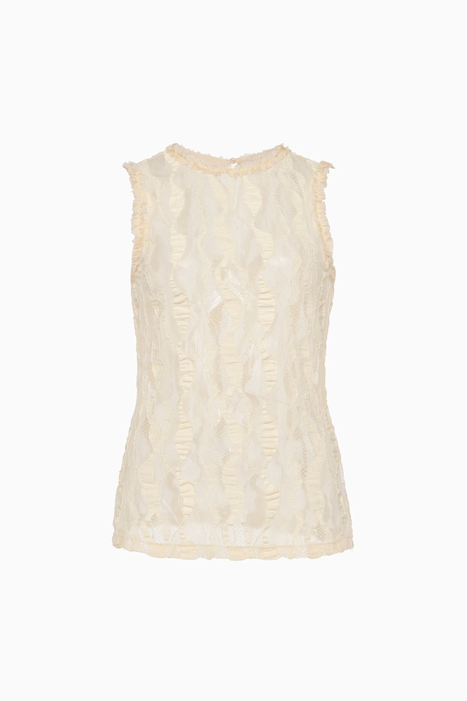 Richly textured, the Theodora Top is crafted from stretch lace knitted with a melding of undulating patterns. This gossamer white tank is trimmed with delicate ruffles and is equally refined worn alone or to underpin cardigans and blazers.