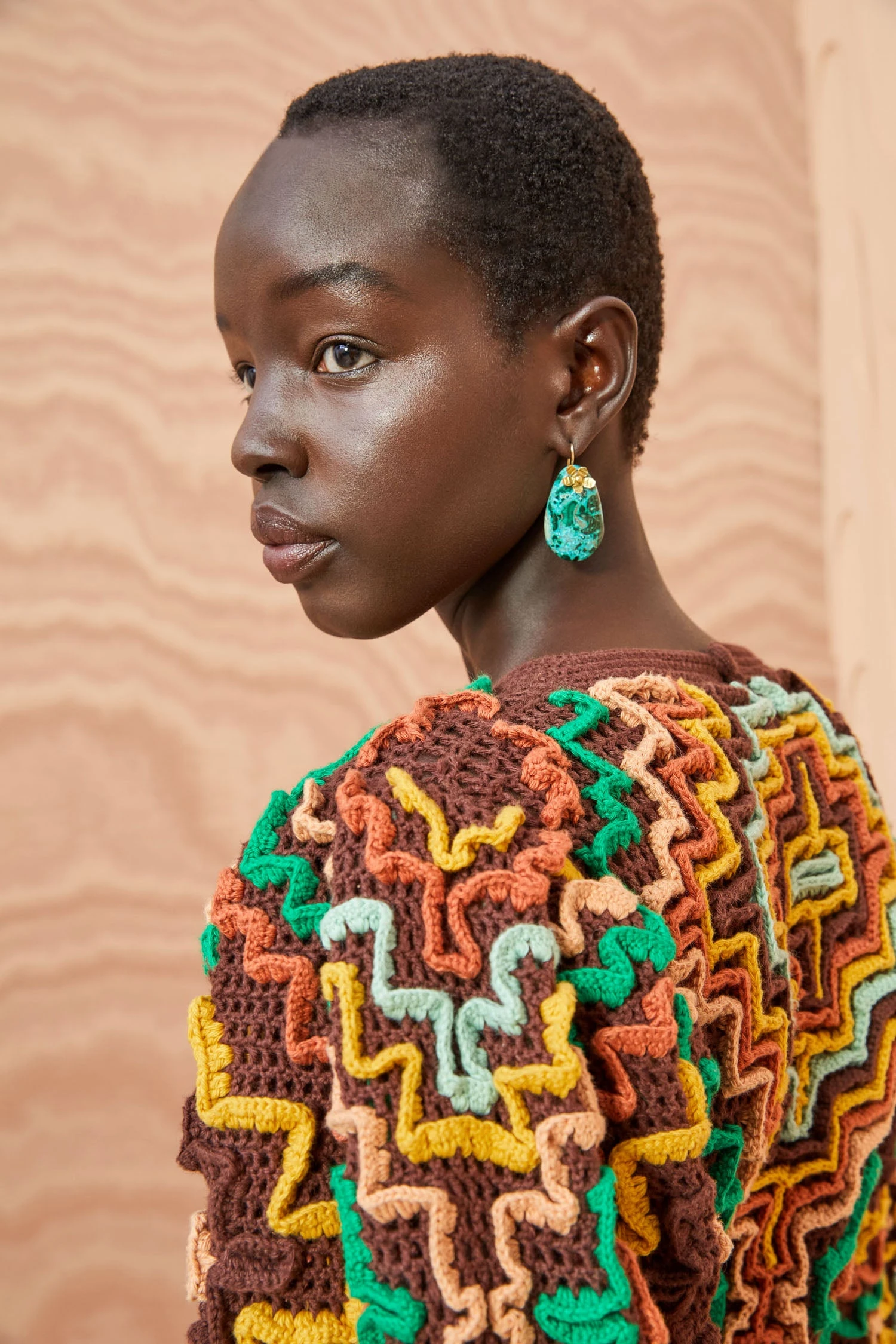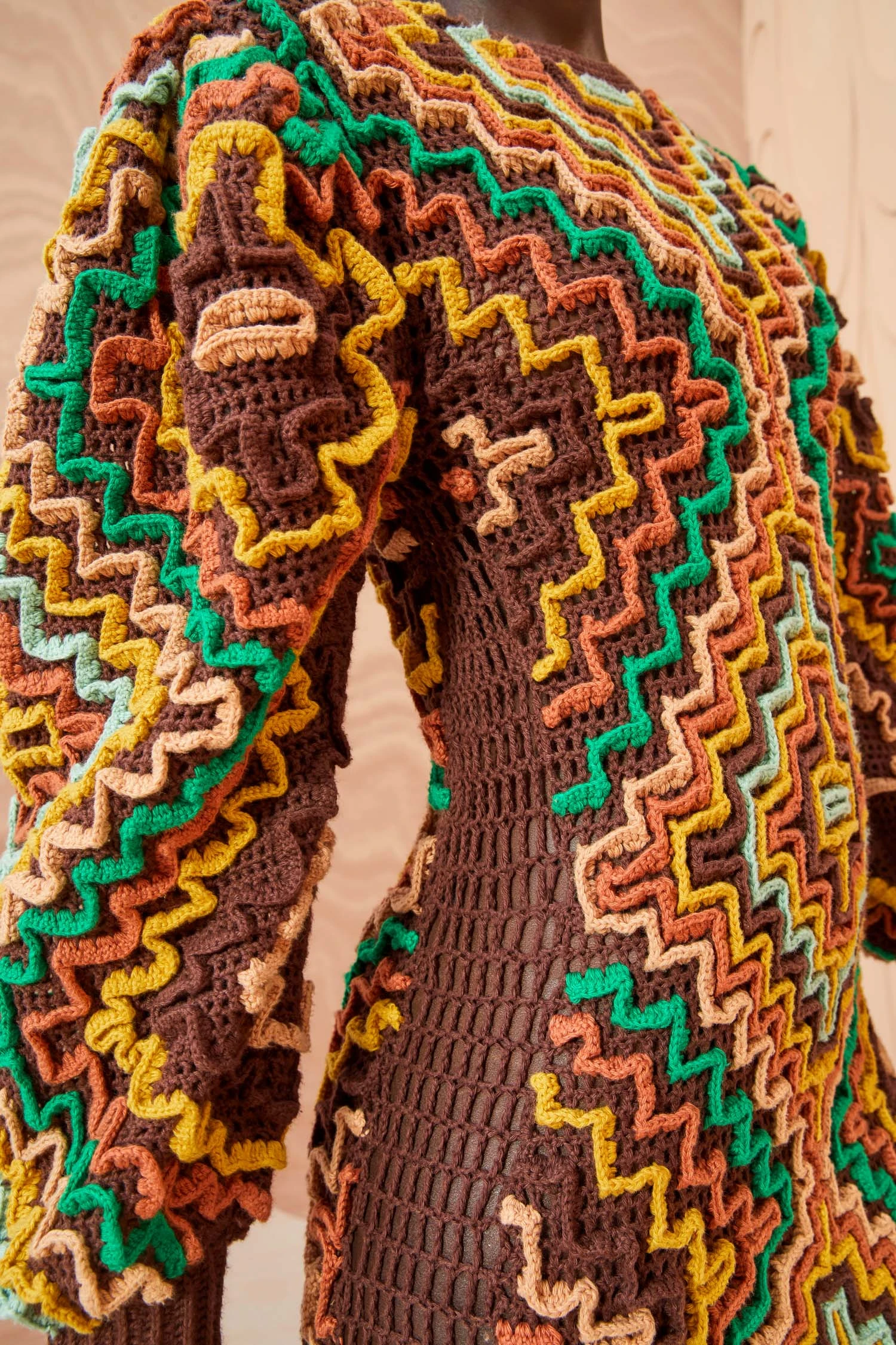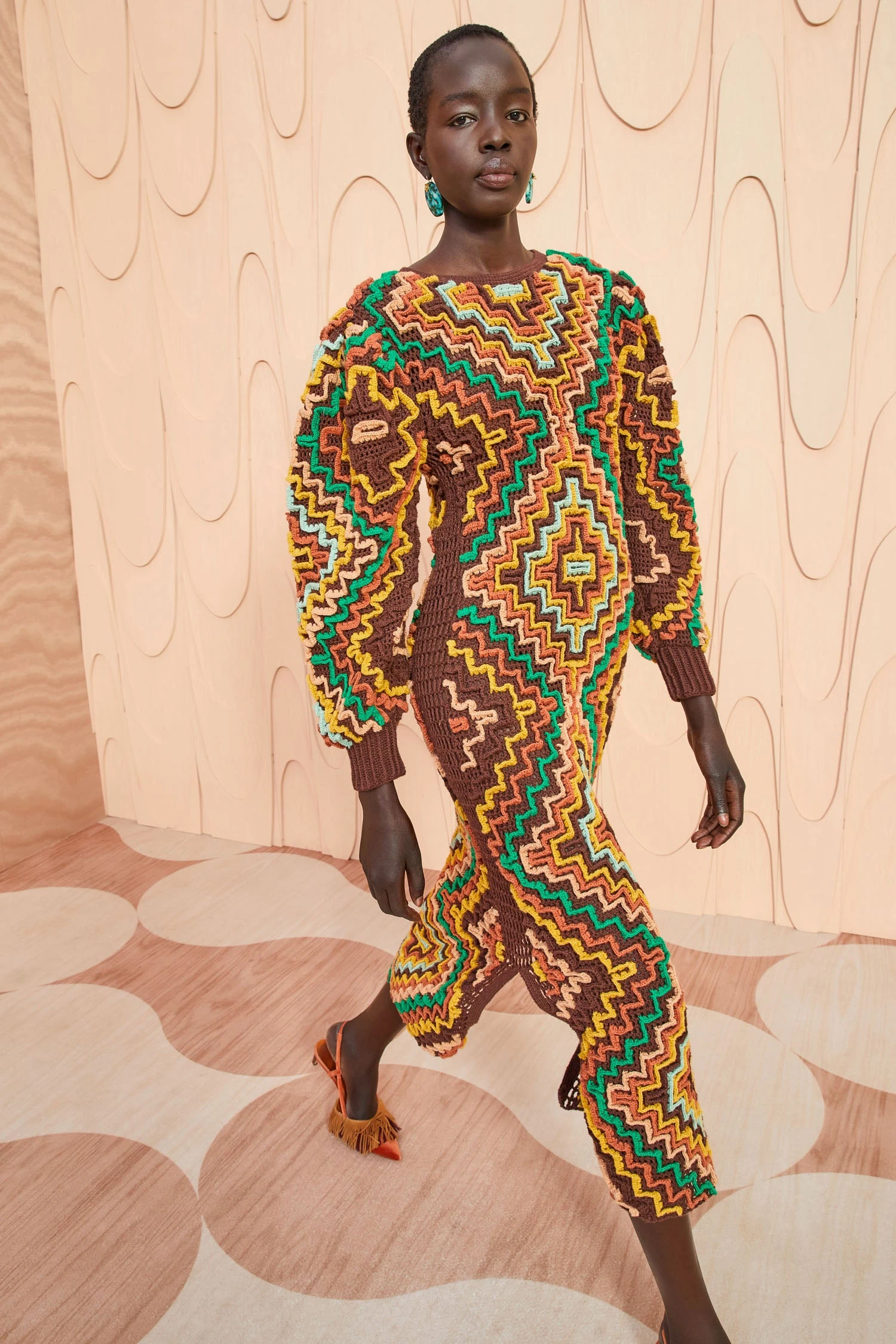 As featured in Look 53 of our Autumn/Winter ’23 Runway Show, the Vayda Dress is handmade by our longtime artisanal partners in Peru. This three-dimensional knit column dress features strips of colorful crochet pieced together to create geometric patterns across the body and full sleeves. This handcrafted beauty is finished with a simple crewneck, full sleeves, and slits at the side-seams.