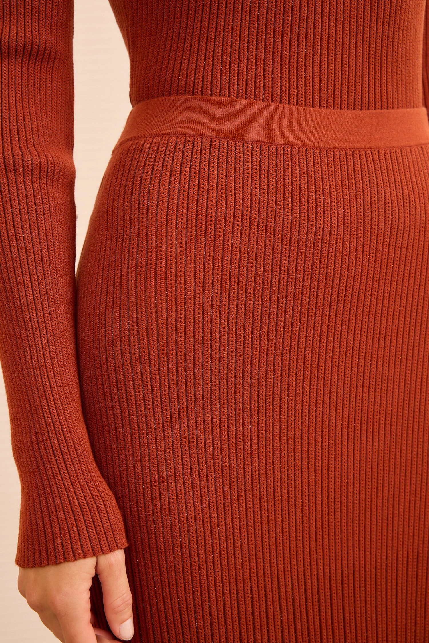 Designed with a pleated flared hem, the Vera Skirt lends poetic movement at every step. It is spun from signature sunburst knit in a rich, burnt orange with lurex yarns that glimmer throughout.